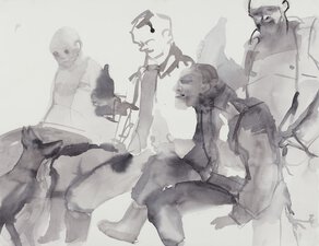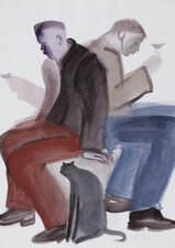 Cornelia Effner, Männer, Vogel und Katze, 2017, Aquarell auf Papier, 59,5x42 cm, Sammlung Kunstvilla, Foto: Annette Kradisch