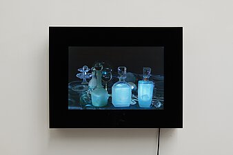 Stefanie Pöllot, Perlen des Wassers, 2023 HD Video, 7’16 min, LCD Monitor mit Plexiglasrahmen, 29,5 x 39,5 x 7 cm, Sammlung Kunstvilla, Foto:Annete Kradisch