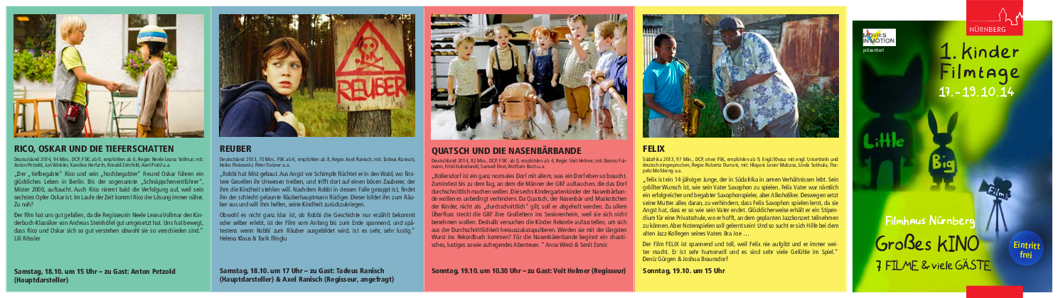 Wir freuen uns sehr, Euch zu Little Big Films, den 1. Kinderfilmtagen begrüßen zu dürfen. Über ein halbes Jahr waren wir auf Filmfestivals unterwegs und haben viele Filme für Euch gesichtet. Herausgekommen ist ein buntes Programm mit einigen Nürnberg-Premieren, mit Filmen aus der ganzen Welt, mit Animations- und Spielfilmen, die mal lustig, mal traurig, spannend und aktionsreich, aber immer bezaubernd und fantasievoll von Kindern und ihren Abenteuern in der Welt erzählen. Nicht nur die Filme, auch unsere Gäste werden uns einiges über ihre Filme zu berichten haben! Man darf gespannt sein!