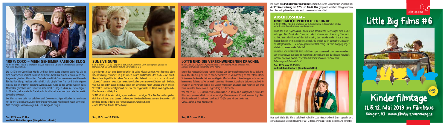 Seit letztem Herbst arbeitet das 13-köpfige-Litte-Big-Films-Team am Programm und präsentiert nun wieder ganz unterschiedliche Filme, die eines gemeinsam haben: Sie erzählen von Kindern und Jugendlichen, die Abenteuer erleben, sich Herausforderungen stellen, Mut beweisen und über sich hinauswachsen, so wie in dem Eröffnungsfilm Meine wunderbar seltsame Woche mit Tess, in dem sich die Ferien für Sam ganz anders entwickeln als erwartet. KIDSBUSTERS ist eine spannende actionreiche Familienkomödie mit viel Witz und Slapstick. DIE KLEINEN HEXENJÄGER spielt in zwei unterschiedlichen Welten, in der sich zwei ungleiche Freunde verbünden. Der Animationsfilm TITO UND DIE VÖGEL kommt wie ein grandioses Ölgemälde daher und erzählt die Geschichte von Tito, der viel Mut beweist und wie ganz beiläufig die Welt rettet. Auch in 100 % COCO – MEIN GEHEIMER FASHION-BLOG wächst die gleichnamige Coco über sich hinaus und lernt zu sich zu stehen, genauso wie es Sune in SUNE VS SUNE tut – aber zuerst schlägt er die falsche Richtung ein. LOTTE UND DIE VERSCHWUNDENEN DRACHEN ist die dritte Leinwandgeschichte von Lotte – hier auf Abenteuer mit ihrer kleine Schwester Roosi. In UNHEIMLICH PERFEKTE FREUNDE bekommt Frido unverhofft einen Doppelgänger – ob Frido damit glücklich wird?