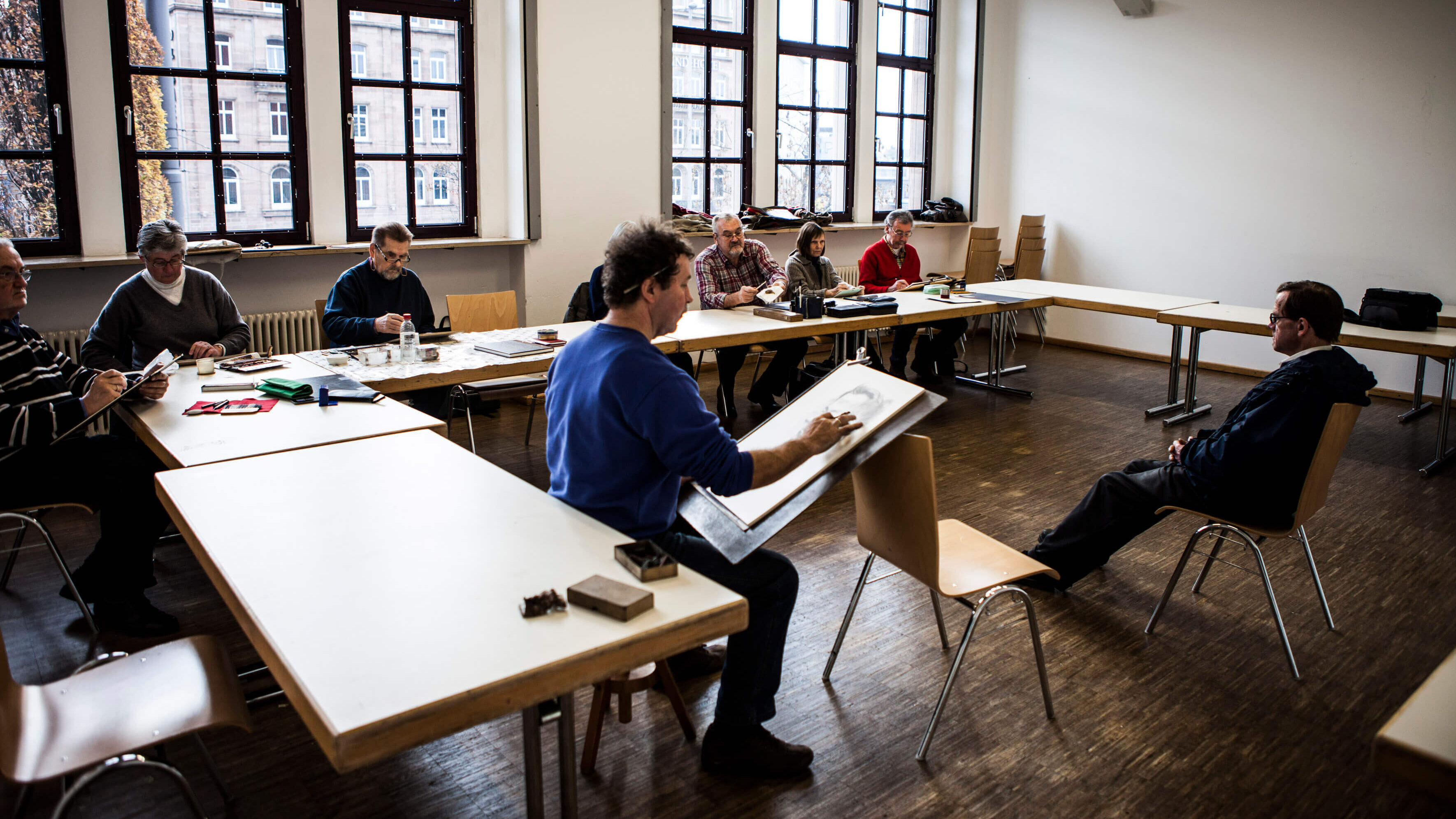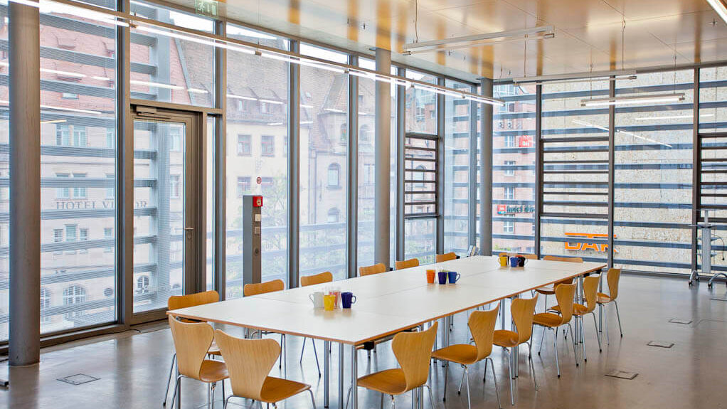 Lichtdurchfluteter Raum mit Ausblick auf die Nürnberger Altstadt