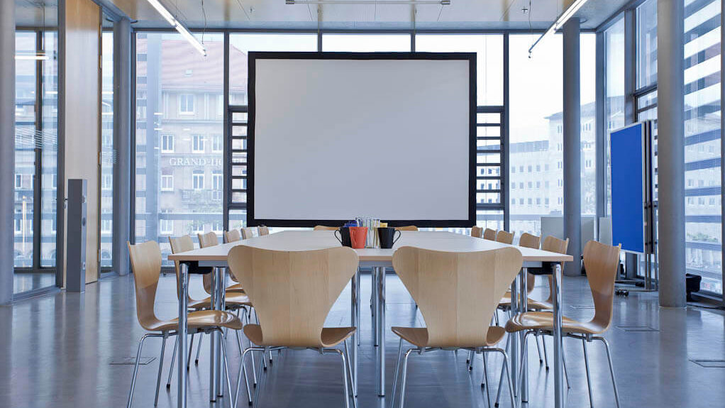 Konferenzsetting mit Tischen für ca 20 Personen.