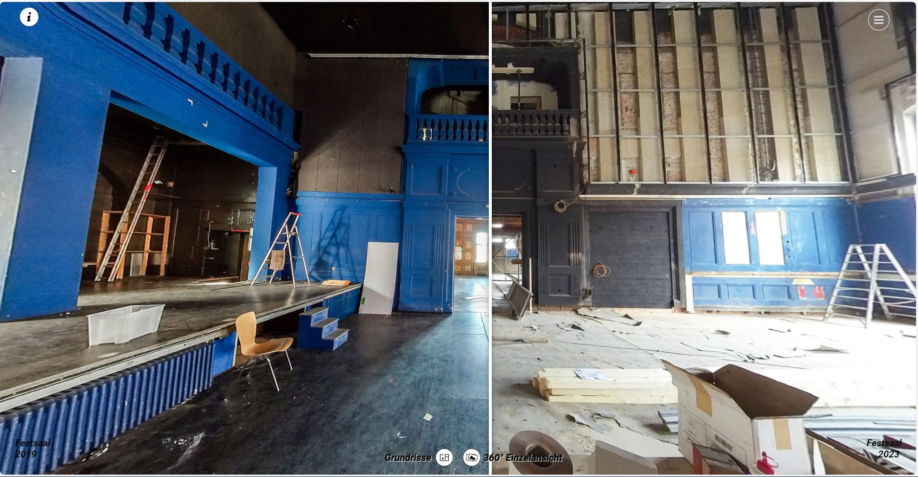 Der virtuelle Rundgang zeichnet sich durch seine direkte Vergleichsmöglichkeit der Anfangs- und der Schlussphase der Sanierung aus. Im Jahr 2019 stand die Renovierung kurz bevor, demensprechend sind die Spuren der letzten Jahrzehnte auch virtuell noch gut zu erkennen: die Festsaal-Bühne und die dazugehörige blaue Wandverkleidung fallen in dem sonst leeren Raum auf, die Putti im ehemaligen Hinterzimmer sind schon eingepackt, die ehemaligen Pächter haben ihre Räume und den Biergarten bereits ausgeräumt und trotzdem lässt sich noch erahnen, wie es dort einmal ausgesehen hat: der Salon, ehemals Hinterzimmer, hat einen Bodenschliff erhalten, die Decke im Festsaal wurde professionell aufgerüstet, die blaue Verkleidung schwarz gestrichen und auch die vielen Graffiti und Aufkleber an Säulen und Wänden im gesamten Haus sind absichtlich erhalten.
