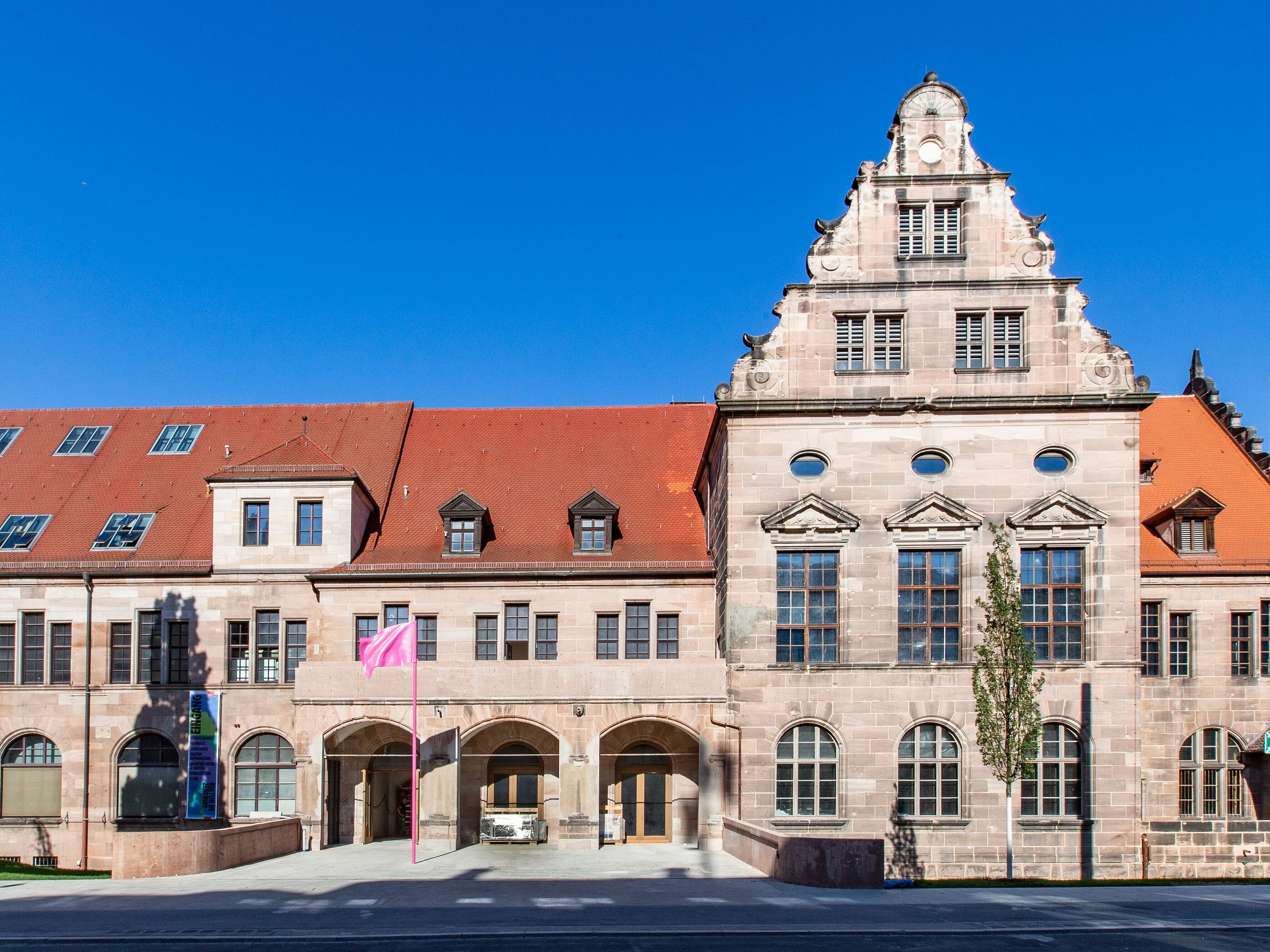 Der Haupteingang des Künstlerhauses mit dem Werk "Flagge zeigen" von Heidi Sill.