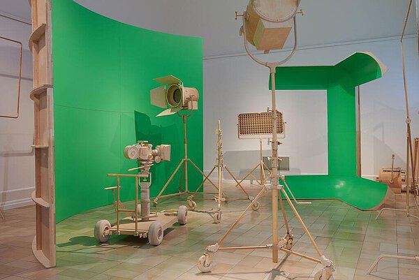 Few works of art put us, the viewers, so directly into a hypothetical situation of action as Oliver van den Berg’s installation Micros from 2006. The hand-made microphones are reduced to their prototypical form. Supplemented by stands and tables, they are used by the artist to stage a heterogeneous ensemble of devices as well as an imaginary media event. All the microphones direct their concentrated attention towards a blank space, so that we ourselves become the news feature of this major media event. However, when we move through the exhibition space, we turn into accomplices of the wooden ensemble, which can be read as a paraphrase of the media industry with its insatiable appetite for information.