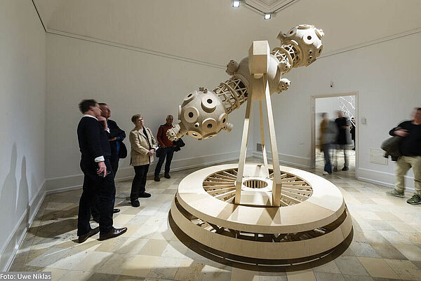 Oliver van den Berg (* 1967 in Essen; lives and works in Berlin) became known for his sculptures and installations based on technical instruments such as flight recorders, radars and star projectors. He translates these into sculptures with a technoid feel. His models from various fields of technology, space and aviation, as well as warfare, are robbed of their function and materiality. Oliver van den Berg often uses softwoods for his sculptures; a traditional sculptural material. In this way, his works “copy” existing objects and yet they are artificial hermaphrodites, meandering between original and copy. Oliver van den Berg’s works are always quotations and variations of existing objects; his sculptural work revolves around the themes of reproduction, repetition and imitation. At the same time, however, his sculptures will always represent his own formal creations, since they are undiminished appropriations and individual reinterpretations. Objects change, for example, when they lose their technical function or their materiality is altered. Suddenly, they pose new questions. Questions to which we have no answers, even when faced by countless microphones: