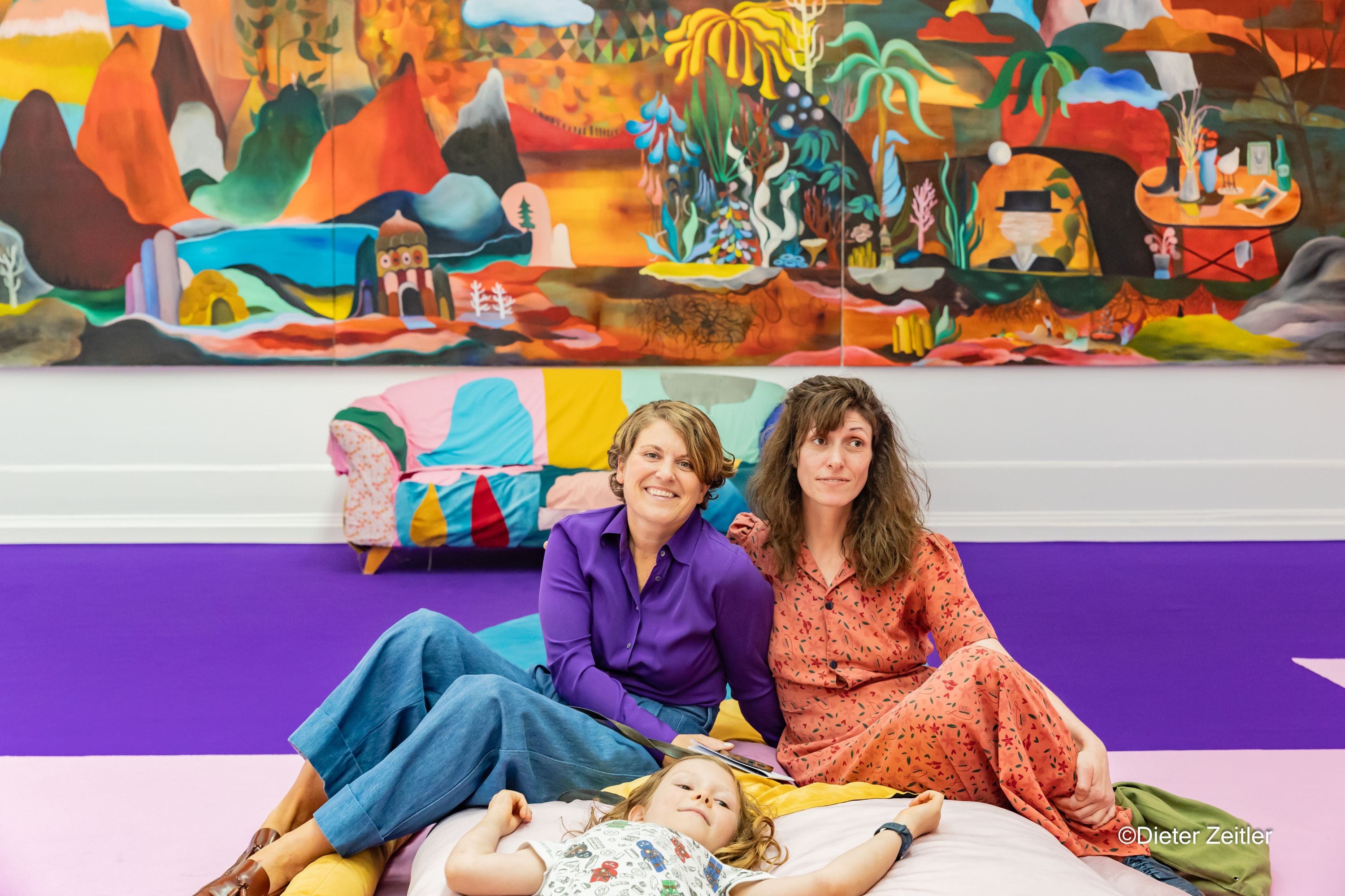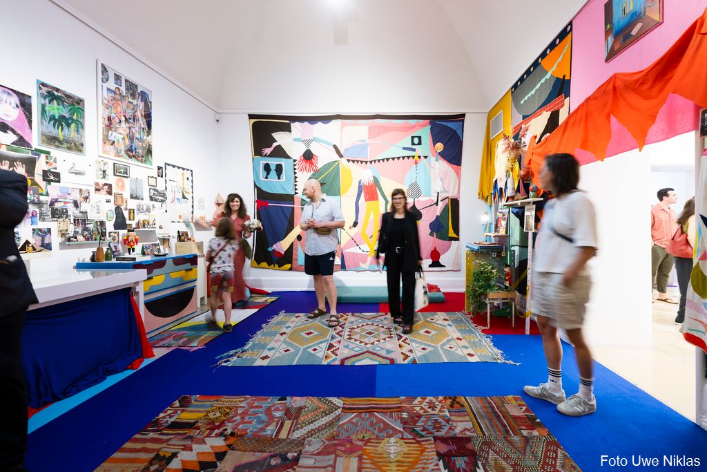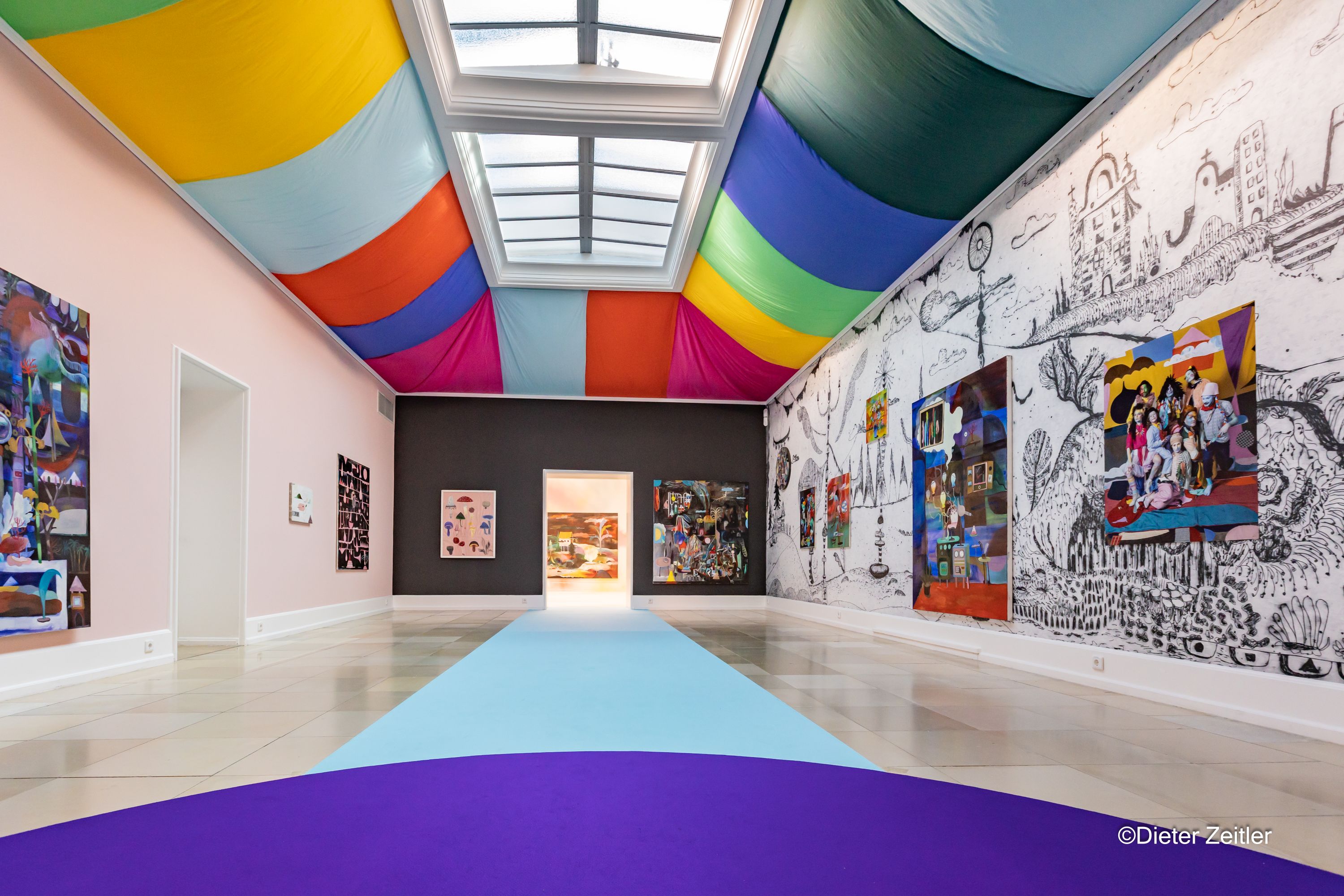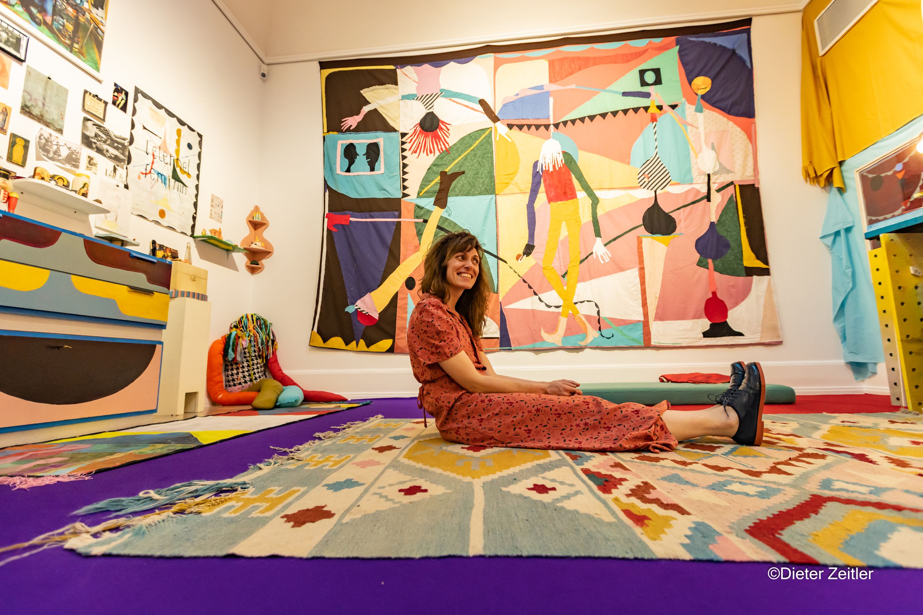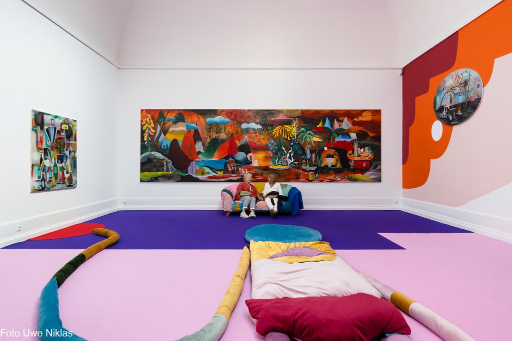Monika Michalko’s oeuvre is characterised by ingenious play with the boundaries between painting, drawing, sculpture, film and performance. Her painting is not limited to two dimensions, either – it becomes voluminous, expands and extends into the third dimension. Characteristic pictorial elements recur on the walls, carpets or as patterns on furniture and objects. The paintings’ formal language is extended into the space as an installation, so that the boundaries between image and space dissolve in a complex interplay, and we ourselves become part of the staging.