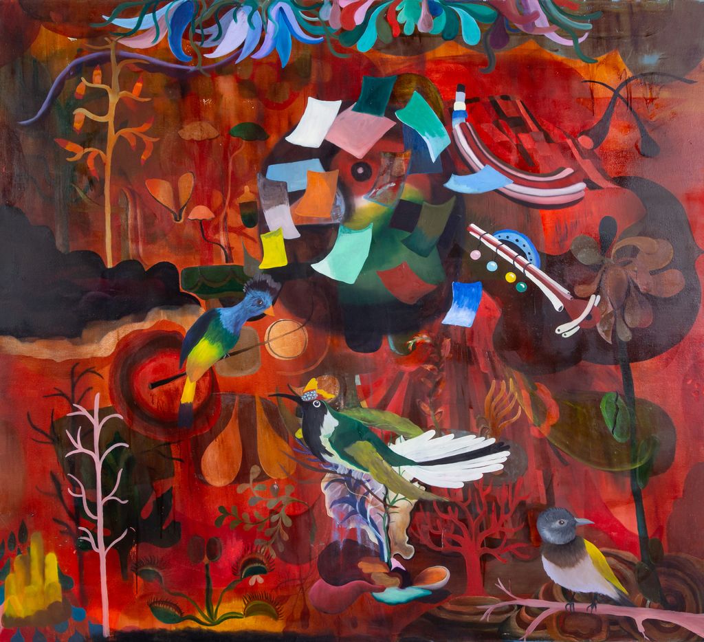 Bäume und Schlingpflanzen, Vögel und Pilze, Behausungen und bühnenbildhafte Interieurs: Monika Michalko (*1982 Sokolov, Tschechien) verbindet in ihrer Malerei figürliche und objekthafte, organische und ornamentale, abstrakte und architektonische Elemente. Ihre Bildkompositionen sind stets fiktiv: Erinnerungen, Phantasmen und traumartige Szenen bilden einen malerischen Kosmos, der durch seine eigenen Gesetzmäßigkeiten definiert ist. Auch die spezifische Tonalität ihrer Werke verstärkt deren traumartige Anmutung. Immer wieder erinnern diese Kompositionen vage an Künstler der Moderne wie Paul Klee, Kasimir Malewitsch, Giorgio de Chirico, Odilon Redon oder James Ensor.