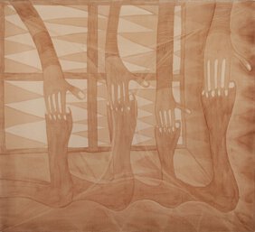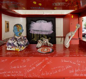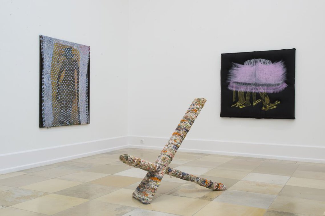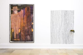 Hands, hats, brooms and a simple house outline. Knife, fork, spoon and the five as a compact tally. Peas, feet, boots and graphic patterns: all these representatives of our life‘s reality are given a special charging in Alex Müller’s work, just as any material in her oeuvre can become artistic material. The artist reinforces the narrative openness of her works by playing cleverly with the boundaries between painting, drawing, sculpture, installation, film, sound and performance. There are no unambiguous demarcations and classifications, both in terms of content and media, and the visual cosmos expands into a broad field of experimentation.