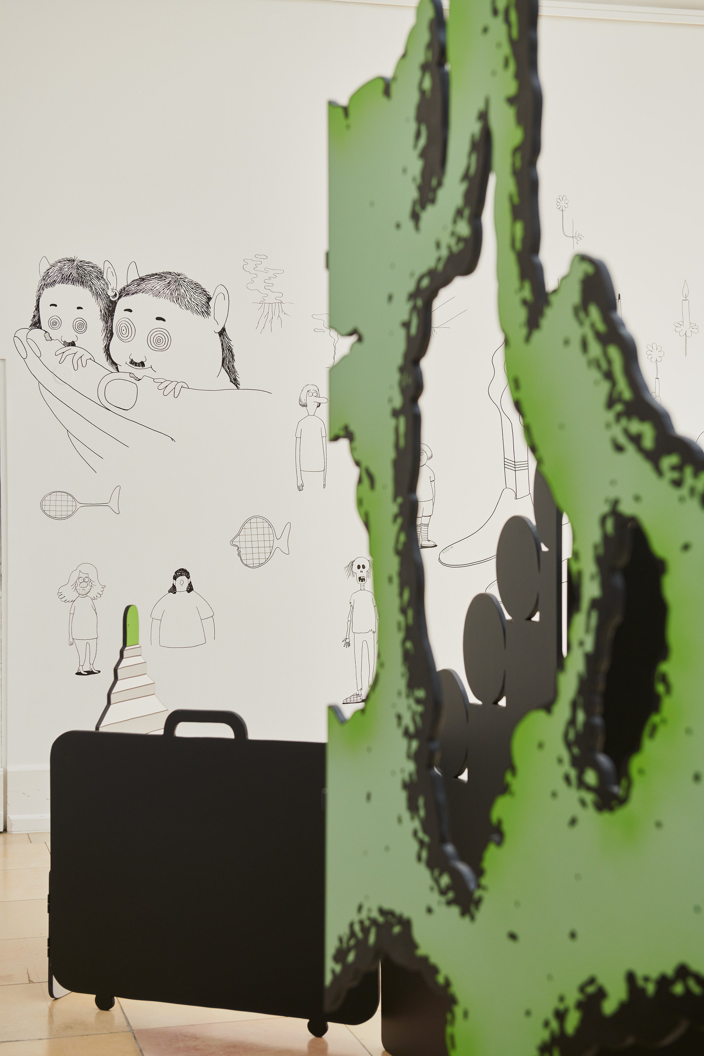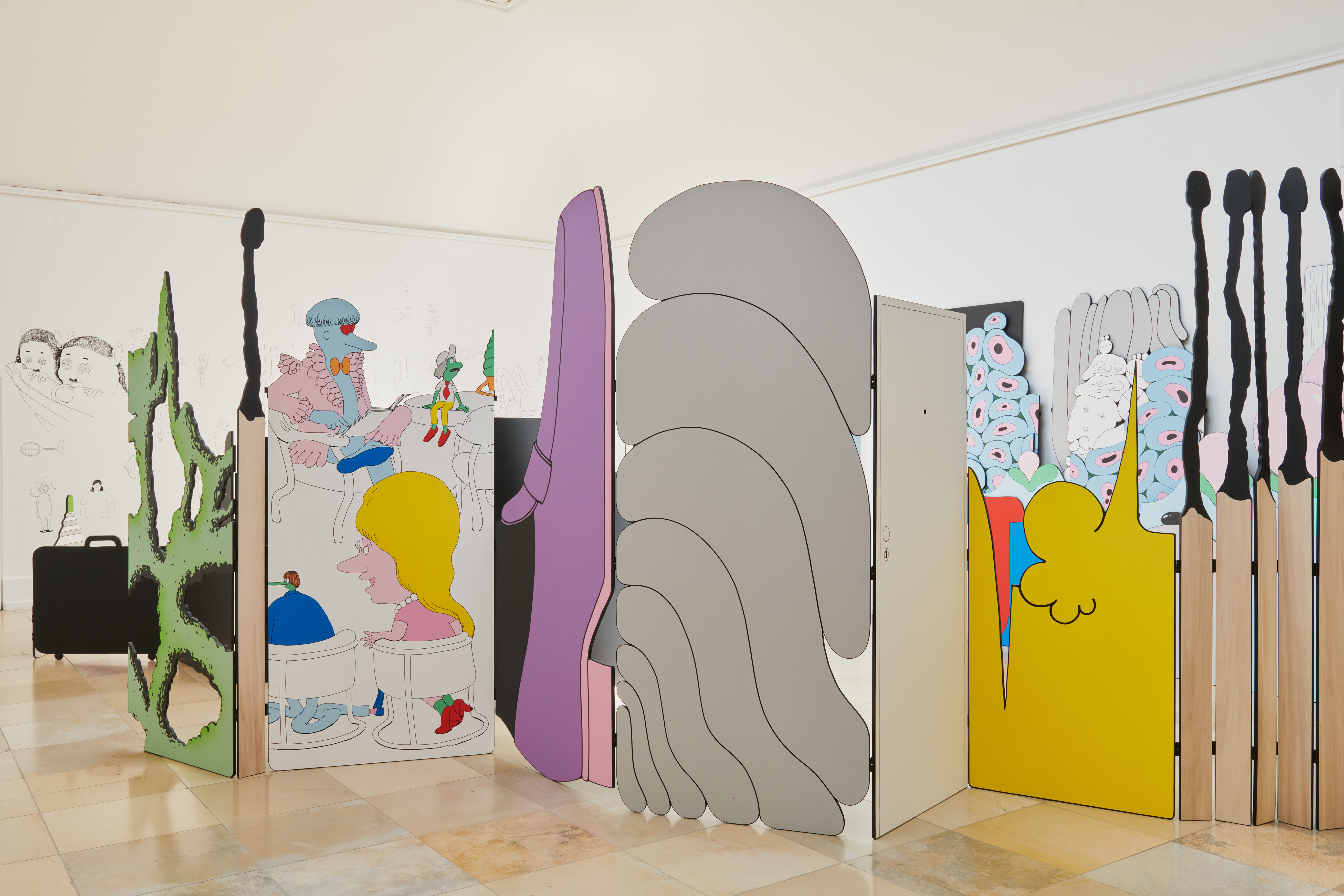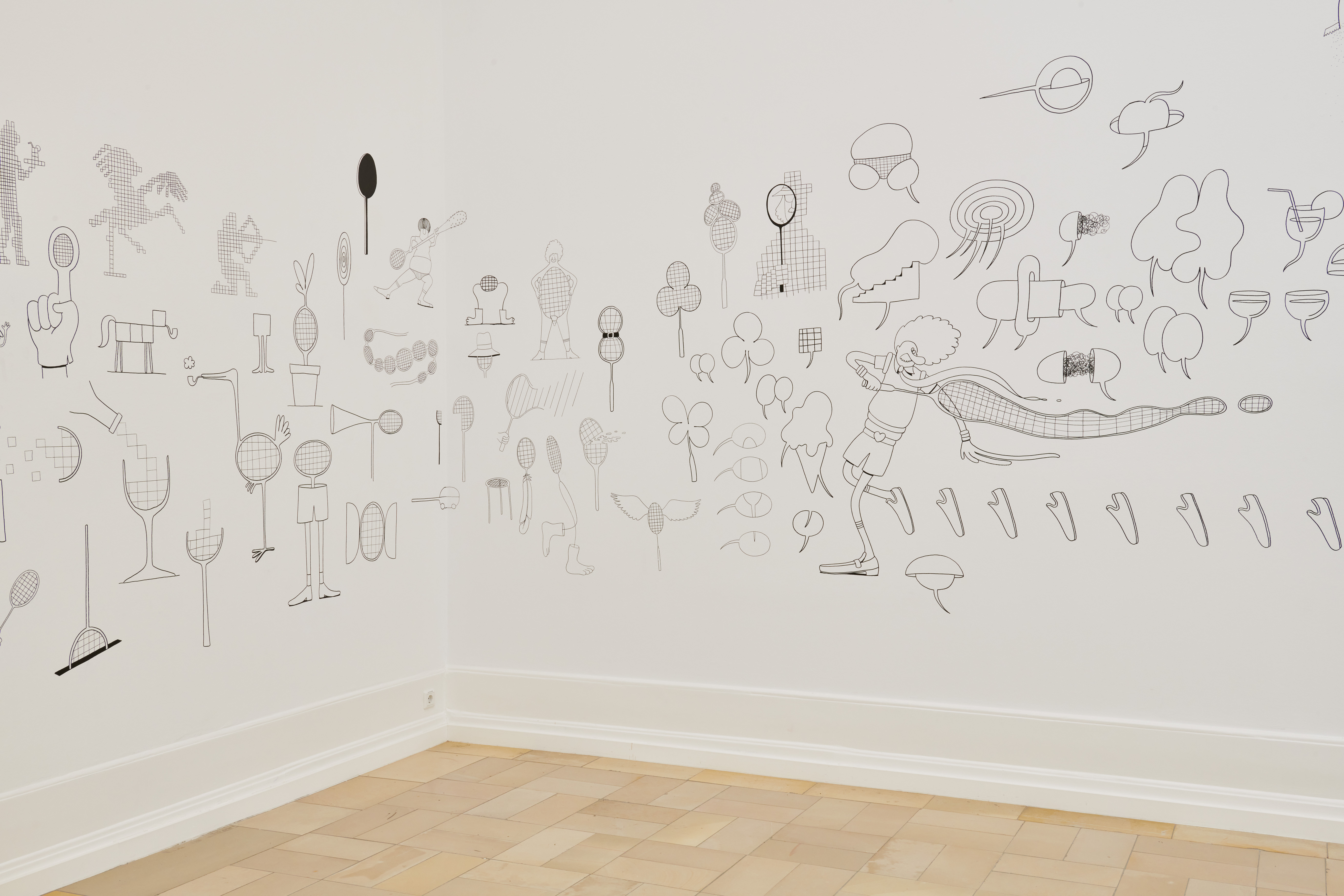Die Kunsthalle Nürnberg zeigt eine umfassende Werkpräsentation, die von Mrzyk & Moriceau speziell für die acht Oberlichtsäle konzipiert wurde und rund 400 Arbeiten vorstellt, darunter ortsbezogene Wandmalereien, Zeichnungen, Animationsfilme, Paravents, Keramikobjekte sowie ein mit Schlägern und Netz ausgestattetes Badmintonfeld, das von den Besuchenden benutzt werden kann.