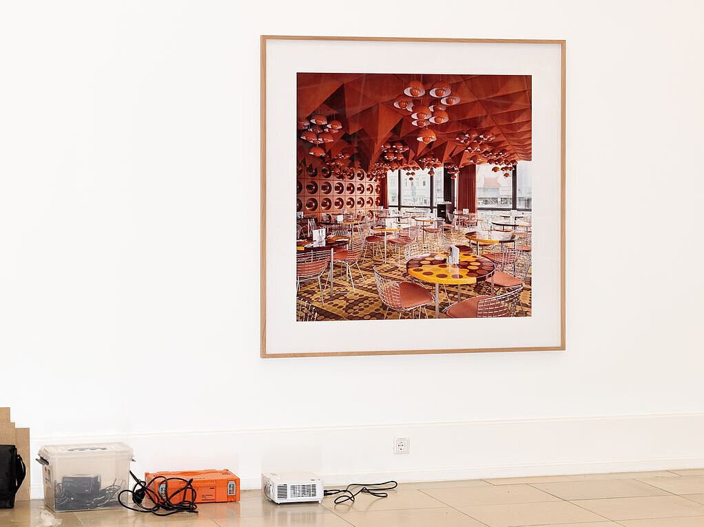In ihrer Fotoserie zur legendären Kantine des inzwischen historischen SPIEGEL-Verlagsgebäudes an der Hamburger Brandstwiete löst sie sich nur teilweise von den Prinzipien ihres stilprägenden Lehrers: Die Räume bleiben wie bei den Becher-Fotografien menschenleer und der Blick dokumentarisch-sachlich. Durch die experimentellere Komposition des Bildausschnitts, die dramatischen Perspektiven und die kräftige Farbigkeit überschreitet die international renommierte Künstlerin aber in einigen der Fotografien diesen klassischen Ansatz. In der vorliegenden Arbeit trägt das zur gefühlten Fremdartigkeit des von Verner Panton (1926 – 1998) konzipierten Raums bei.