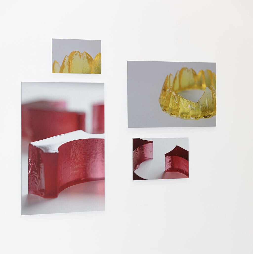 Mit diesen Themen befasst sich Susan Pietzsch auch in ihrer Arbeit Der Tisch als Bühne. Our food as the new fetish, die ein Ensemble aus farbigem Kanten zeigt. Kanten ist ein altes traditionelles Nahrungsmittel Japans, das aus Amakusa-Algen hergestellt und zu den unterschiedlichsten, meist süßen Gelees verarbeitet wird. Dieses klassische Verfahren hat Susan Pietzsch aufgegriffen und aus geometrischen Formen eine Landschaft gestaltet, die sie auf einem Tisch inszeniert und dann aus verschiedenen Perspektiven fotografiert hat. Die Detailaufnahmen zeigen einen ungewohnten Blickwinkel und verändern damit unsere Wahrnehmung: Die Textur des Gelees ist deutlich zu erkennen, die Formen erscheinen überlebensgroß. Aus der Distanz wirkt das Ensemble wiederum sehr architektonisch und erinnert an ein Stadtmodell. Die tatsächliche Größe der Objekte wird auf einmal erkennbar, der Zusammenhang sichtbar – der Tisch wird zur Bühne, auf der Essen als Lifestyle inszeniert ist.