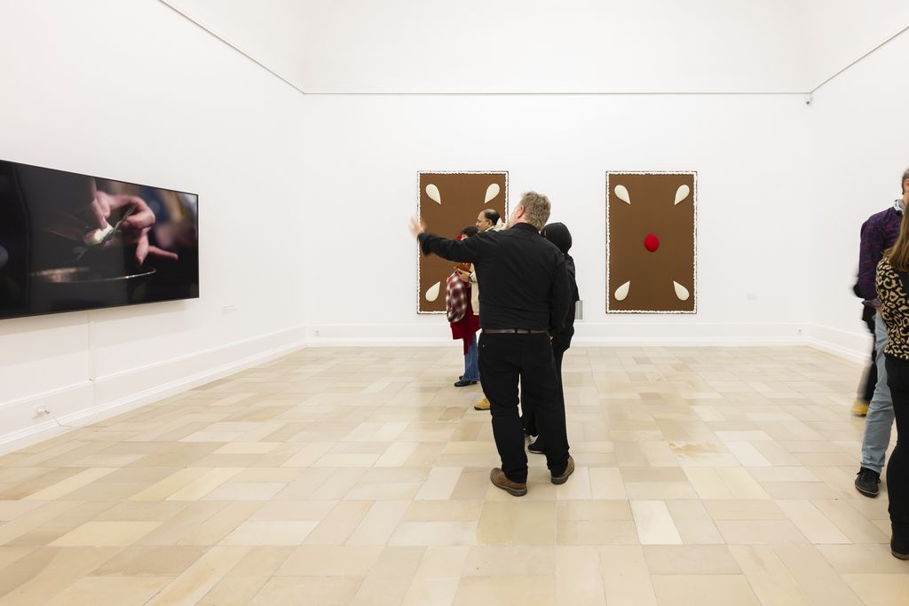 Diese Traditionen aufgreifend, haben Maik und Dirk Löbbert für die Kunsthalle Nürnberg eine Arbeit entwickelt, für die sie Rotwein eines Nürnberger Winzers verwendet haben. Das Rechteck, das in den Ausstellungsräumen auf einer der Wände schwebt, wurde von den beiden Brüdern mit dem Nürnberger Rotwein direkt auf die Wand gemalt. Die Form greift die geometrischen Strukturen der Architektur, die Proportionen der Wand und das Raster des Bodens auf, ist aber leicht aus der Symmetrie gerückt und bringt damit den gesamten Raum zum Klingen.
