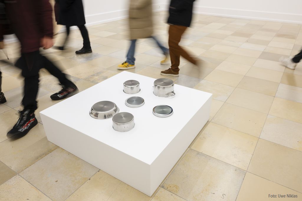 Zunächst grundiert er die metallenen Flächen der Topfböden mit mehreren Schichten Acrylfarbe, um dann mit Ölfarbe malerisch eine illusionistische Darstellung eben jener Spiegelung anzubringen, die vorher dort zu sehen war. Der Topf wird damit zum Bildträger. Auf seinem Boden befindet sich nun ein Gemälde, das auf den ersten Blick nicht unbedingt als solches zu erkennen ist. Die Wirkung ist so täuschend echt, dass zwischen Bild und Realität zunächst kaum zu unterscheiden ist. Erst beim eingehenden Betrachten wird deutlich, dass sich die Lichtreflexe beim Umschreiten nicht verändern, sie malerisch zum Stillstand gebracht wurden. Der Grad der Illusion und die Form der Interpretation des Phänomens der Spiegelung erschließen sich erst nach und nach.