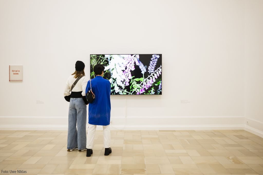Hört auf zu kochen – welch ein Diktum! Im roten Stempeldruck auf ein Küchenhandtuch gedruckt und wie ein traditionelles Tafelbild auf Keilrahmen gespannt, erinnert es wohl gerade ältere Betrachter*innen an Jörg Immendorfs Bild Hört auf zu malen von 1966. Beide Forderungen sind ähnlich in ihrer Absurdität, denn bekanntlich endete damals weder die Geschichte der Malerei, noch war 2017 ein Ende der Zubereitung von Speisen in Sicht.