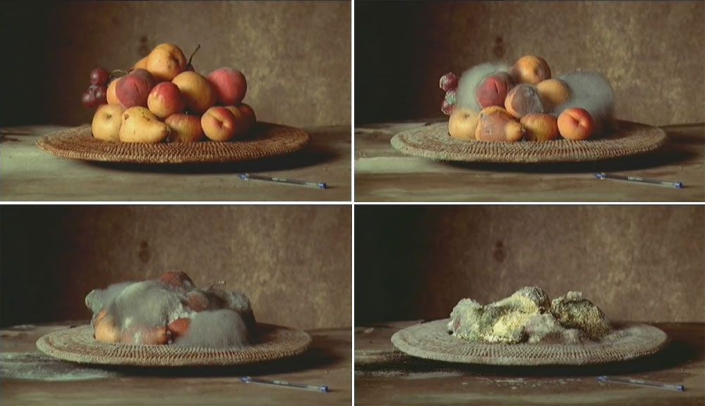 Das 1-Kanal-Zeitraffervideo mit einer Länge von 3 Minuten und 44 Sekunden ist mindestens irritierend: Man sieht das Standbild eines prallen Stilllebens aus Obst, das klassisch auf einer geflochtenen Platte arrangiert ist. Einzig ein in der unteren rechten Ecke liegender Kugelschreiber verrät, dass es sich bei dem Film um eine zeitgenössische Arbeit handelt. Anfangs ist die Veränderung im Bild trotz des Zeitraffers kaum sichtbar, nur das Licht und die Farben ändern sich subtil. Bis irgendwann ein sanfter blauer Flaum auf den Früchten erscheint, wie frisch gefallener Schnee auf einer Gebirgslandschaft. Er wächst und überzieht die Äpfel, bis sie ganz unter dem Myzel des Schimmels verborgen sind. Nun schrumpft das Gebilde, man scheint zu spüren, wie das Obst seine strukturelle Kraft verliert. Am Ende liegt ein weicher Schimmelhügel auf dem Tisch, nur der Kugelschreiber aus Kunststoff bleibt unverändert.
