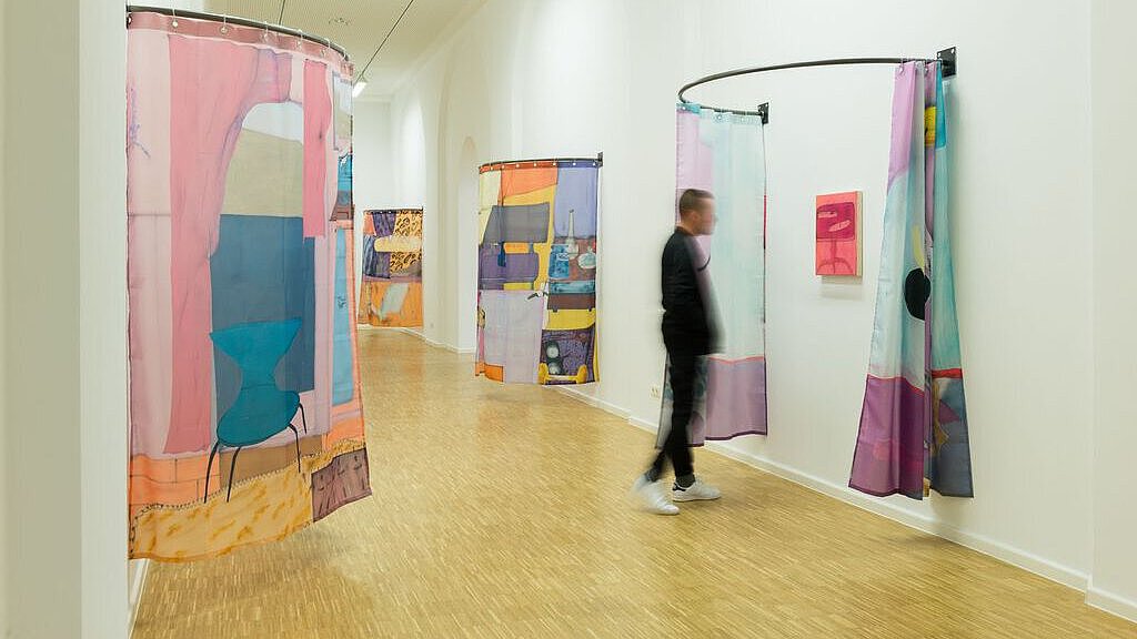 Das Œuvre von Monika Michalko ist geprägt durch ein kluges Spiel mit den Grenzverläufen zwischen Malerei, Zeichnung, Skulptur, Film und Performance. Zugleich beschränkt sich ihre Malerei nicht auf die Zweidimensionalität, sondern sie wird volumenhaft, dehnt sich aus und greift in die dritte Dimension. Charakteristische Bildelemente kehren auf Wänden, Teppichböden oder auch als Muster auf Mobiliar und Objekten wieder. Die Formensprache der Bilder wird installativ in den Raum erweitert, sodass sich die Grenzen zwischen Bild und Raum in einem komplexen Zusammenspiel auflösen und wir zu einem Teil der Inszenierung werden.