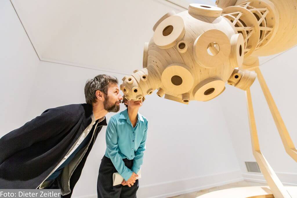 Oliver van den Berg (* 1967 in Essen; lives and works in Berlin) became known for his sculptures and installations based on technical instruments such as flight recorders, radars and star projectors. He translates these into sculptures with a technoid feel. His models from various fields of technology, space and aviation, as well as warfare, are robbed of their function and materiality. Oliver van den Berg often uses softwoods for his sculptures; a traditional sculptural material. In this way, his works “copy” existing objects and yet they are artificial hermaphrodites, meandering between original and copy. Oliver van den Berg’s works are always quotations and variations of existing objects; his sculptural work revolves around the themes of reproduction, repetition and imitation. At the same time, however, his sculptures will always represent his own formal creations, since they are undiminished appropriations and individual reinterpretations. Objects change, for example, when they lose their technical function or their materiality is altered. Suddenly, they pose new questions. Questions to which we have no answers, even when faced by countless microphones: