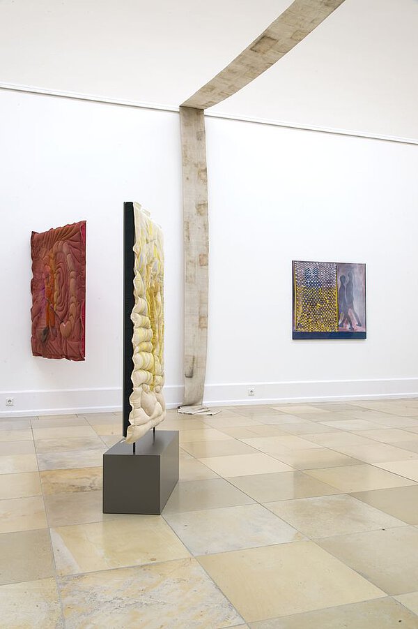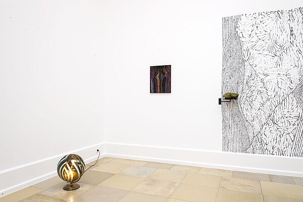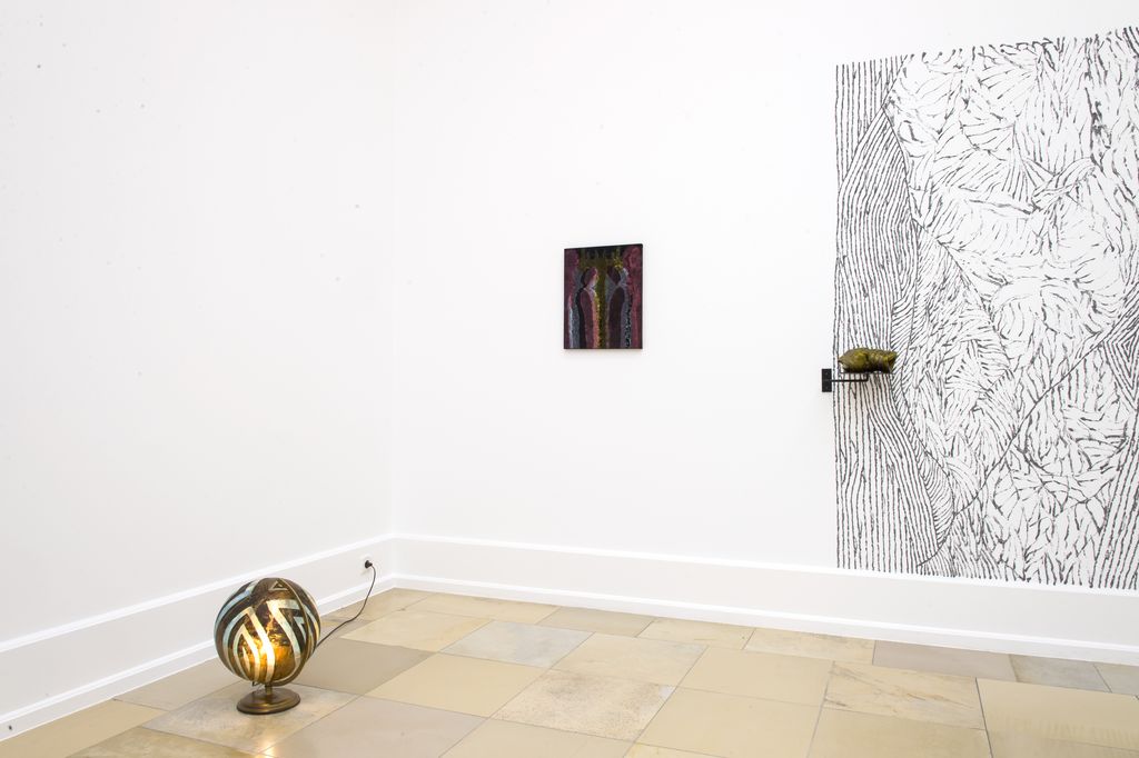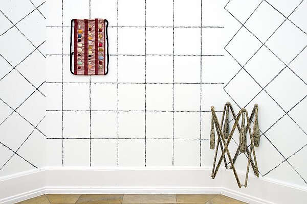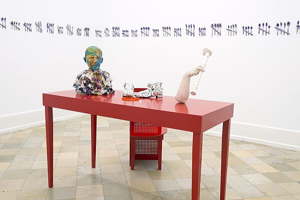 Hands, hats, brooms and a simple house outline. Knife, fork, spoon and the five as a compact tally. Peas, feet, boots and graphic patterns: all these representatives of our life‘s reality are given a special charging in Alex Müller’s work, just as any material in her oeuvre can become artistic material. The artist reinforces the narrative openness of her works by playing cleverly with the boundaries between painting, drawing, sculpture, installation, film, sound and performance. There are no unambiguous demarcations and classifications, both in terms of content and media, and the visual cosmos expands into a broad field of experimentation.