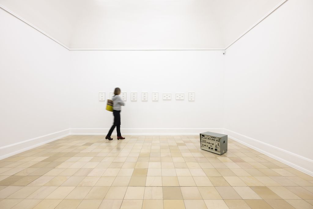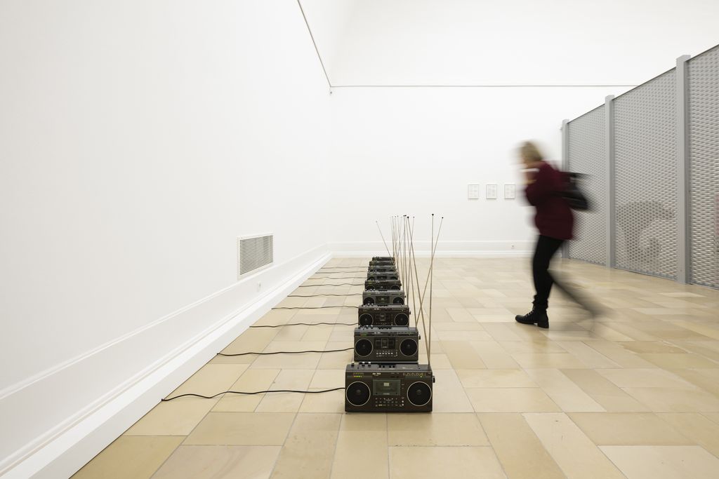 Die Künstlerin platziert einen Fernseher, ein Telefon, eine Schreibmaschine und ein Radio im Ausstellungsraum. Ob es sich dabei um Geräte, hergestellt zur systematischen Aufzeichnung und Übertragung oder nur um Haushaltsgegenstände handelt, bleibt offen. Die Dimension der kabinetthaften Ausstellungsräume erinnert vielleicht an ein häusliches Umfeld, doch ein Rauschen durchdringt den Raum – ein knisterndes Geräusch, das ein abgehörtes Gespräch oder eine geheime Aufnahme oftmals begleitet.