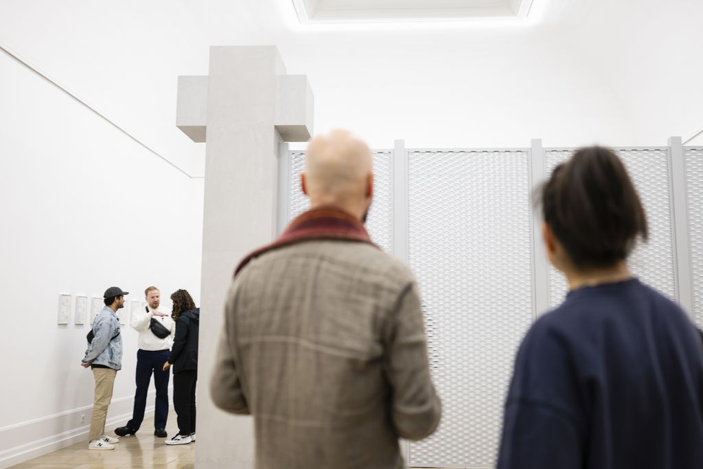 One Thousand Times, 2023: Mächtige Kreuze und weitgehend blickdichte Lochblechzäune erzeugen im folgenden Raum ein Gefühl von Ein- und Ausgrenzung. Die Kreuze, welche die Zäune im Raum verankern, beziehen sich auf architektonische Stützelemente, die Sung Tieu in Sao Paulo in einem Parkhaus entdeckte und hier in ihre Installation übersetzt. Vor dem thematischen Hintergrund der Ausstellung tritt das komplizierte Verhältnis beider Staaten zur christlichen Religion ins Bewusstsein.
