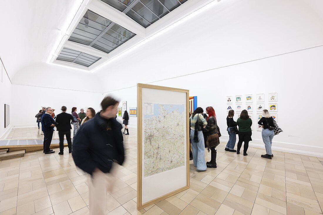 Dünne Fäden zeichnen ein abstraktes Spinnennetz auf papierene Landkarten, aufgespannt auf die ockerfarbene Gewebefläche eines Paravents: Die sehr persönliche Weltsicht des Künstlers ist in der Ausstellung zu sehen, gestickte Wege im Umriss der Umgebung. Es sind dialektische, mehransichtige Materialgrafiken, die seltsam changieren zwischen Zeichnung, Freirelief und Rauminstallation.