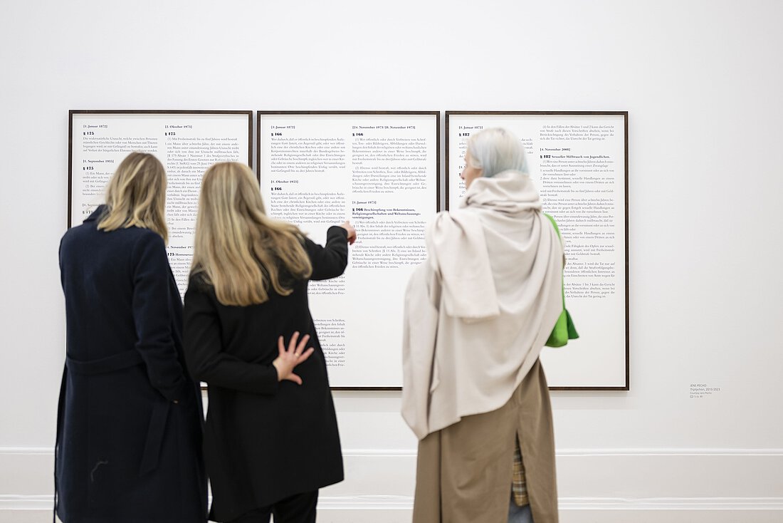 In seinem Triptychon dokumentiert Jens Pecho (*1978) die historische Entwicklung und die Veränderungen dreier Paragrafen des Strafgesetzbuches. Beginnend mit ihrer Einführung bei der Reichsgründung 1871 zeichnet er die Veränderungen, Erweiterungen und Streichungen bei den Paragrafen 175 (Verbot von Homosexualität), 166 (Verbot von Beschimpfung von Bekenntnissen, Religionsgesellschaften und Weltanschauungsvereinigungen) und 182 (Verbot von sexuellem Missbrauch von Jugendlichen), in der Weimarer Republik, unter der Herrschaft der Nazis bis zu ihrer aktuellen Fassung nach. Im Zuge der Demokratisierung Deutschlands verschieben sich auch die Inhalte und Sichtweisen auf die "Straftaten" wie auch der Sprachgebrauch und die Gesetzeslage. Im Fall des § 175 bedeutet dies, dass dieser 1994 endgültig aus dem Strafgesetz gestrichen wurde.