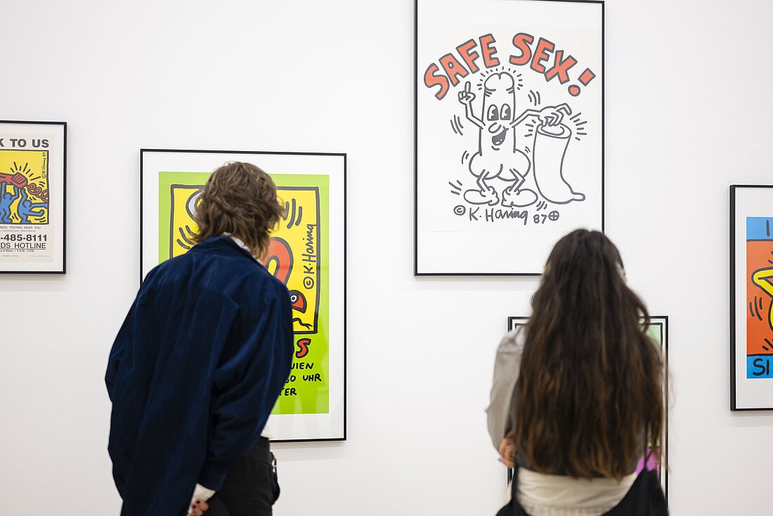 Es ist schwer, nicht an Keith Haring (1958-1990) zu denken, wenn man den Begriff „Queer Art“ hört. Durch seine Rolle als ein Pionier der Street-Art, als Ikone der Pop-Art und als politischer Aktivist reiht er sich neben Andy Warhol oder Michel Basquiat in die Riege der großen Namen der New Yorker Kunstszene ein. In den rührenden Motiven und komplexen Wimmelszenen seiner ikonischen Strichfiguren, die anfangs in den Metrostationen und öffentlichen Toiletten New Yorks auftauchten, hat der Maler eine klare politische Haltung kommuniziert. Die erwächst auch aus seiner Identität als homosexueller Mann, der sich in den 1980er-Jahren mit der anfangs „Schwulenpest“ genannten neuen Seuche AIDS infiziert und ihr 1990 zum Opfer fällt. Die verheerende Wirkung der viralen Immunschwächeerkrankung, die hauptsächlich durch sexuellen Kontakt übertragen wird, verarbeitet er in emotionalen Tags und Malereien, die in der Folge unter anderem von der New Yorker Act-up-Bewegung aufmerksamkeitswirksam für ihren öffentlichen Kampf gegen die Seuche genutzt wird; denn außerhalb der queeren Community interessieren sich anfangs nur herzlich wenige Entscheidungsträger*innen für die horrenden Todeszahlen. Haring begegnet diesem politischen Zynismus mit Bildern voller Liebe, Vergebung und eindringlichen Plädoyers gegen das Trennende zwischen uns allen, wie die acht in der Ausstellung versammelten Plakate eindrücklich zeigen: Mit bestechend einfacher Bildsprache thematisiert der Künstler queere Themen wie das Coming-out, Drag Partys und immer wieder AIDS. Die in der Kunsthalle ausgestellten Plakate reflektieren sowohl diese Themen als auch sein persönliches Engagement für die queere Community. Seine Malweise und Botschaft gehen dabei eine bemerkenswerte Symbiose ein, die noch heute in der Erkenntnis gipfeln könnte: Wir sind als Menschen alle miteinander verbunden.