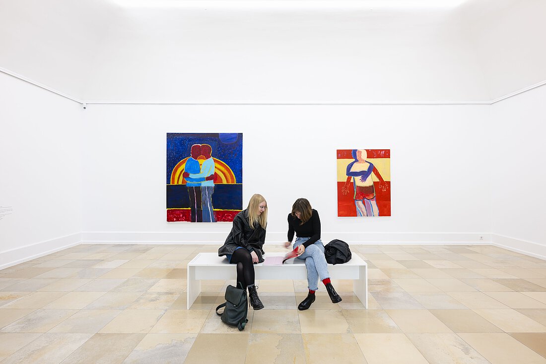 Die eindrucksvollen Gemälde von Katherine Bradford (*1942) sind leuchtende, üppige Kompositionen. Ihre Figuren, die keine individuellen Merkmale zeigen und weder männlich noch weiblich oder beides sind, bleiben vage, schweben im Raum und materialisieren sich nicht vollständig. Immer wieder begegnen uns Paare, die sich küssen, berühren, umarmen. Eine narrative Dimension wird angedeutet, gerade wenn Superheld*innen ihre bonbonfarbenen Bildwelten bevölkern. Weitergesponnen werden diese Erzählungen jedoch in unseren Köpfen: Katherine Bradford zeigt traumähnliche Situationen, die sich in Schwimmbecken, am Strand, im Nachthimmel oder Weltraum zutragen.