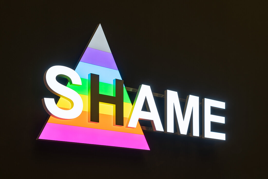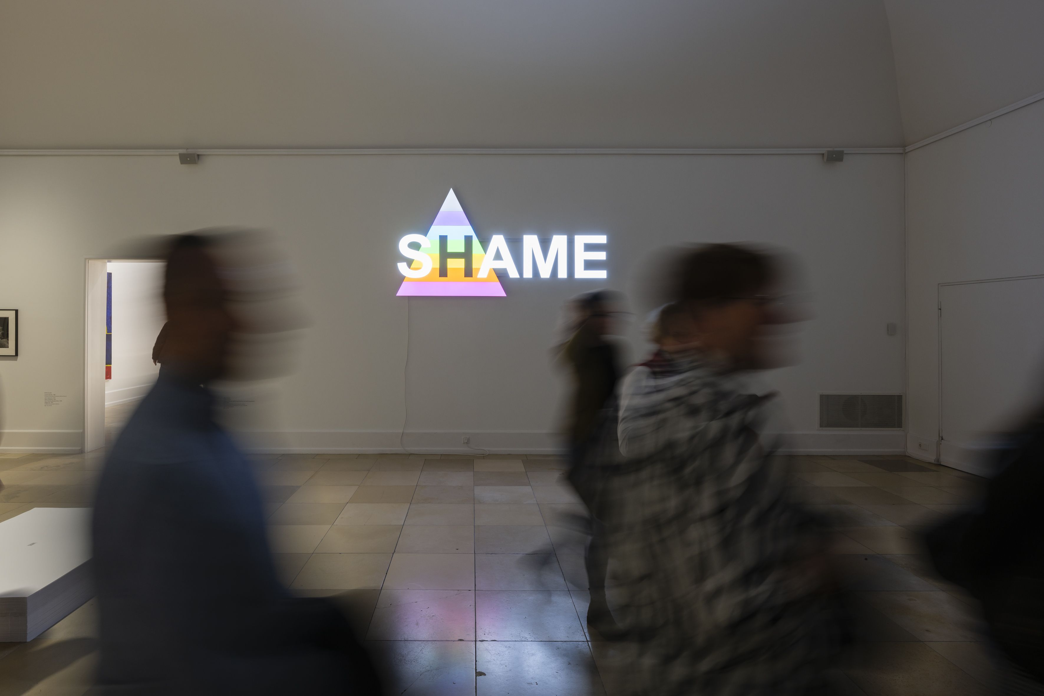 Der Entwurf für die Installation Same/Shame von Jens Pecho (*1978) entstand 2019 ursprünglich im Rahmen eines Wettbewerbs der Stadt Düsseldorf für ein Denkmal zur Erinnerung und Akzeptanz geschlechtlicher und sexueller Vielfalt. Shame, was sowohl die Beschämung durch andere als auch das eigene Schamempfinden bedeuten kann, bezeichnet einen Aspekt queeren Lebens, der durch die lange Tradition systematischer Stigmatisierung eine traurige Allgegenwärtigkeit besitzt. Nicht grundlos steht der Begriff Pride (Stolz) als Gegenteil der Scham für die Selbstermächtigung queerer Menschen und den Kampf gegen Diskriminierung. Diese Ambivalenz manifestiert sich nicht nur in dem flackernden Wortspiel zwischen „same“ und „shame“, sondern auch in der Farbgebung des Dreiecks, dessen bunte Streifen referenziell auf die Pride-Flag der LGBTQ+ Community zu verweisen scheinen. Die trianguläre Form nimmt Bezug auf eines der dunkelsten Kapitel der Geschichte. Der „Rosa Winkel“ (mit einer Spitze nach untern weisend) diente als Kennzeichnung homosexueller Häftlinge in den Konzentrationslagern des Naziregimes. Später erfuhr dieses Symbol der Unterdrückung allerdings eine Rückaneignung durch die Community und wurde in umgedrehter Form (nun weist die Spitze nach oben) zu einem Symbol der AIDS-Bewegung. So äußert sich in der Installation, die von einem Klangstück begleitet wird, das stete Wechselspiel von Scham und Unterdrückung im Gegensatz zum Stolz und dem kämpferischen Trotzen gegen Stigmata und Marginalisierung.