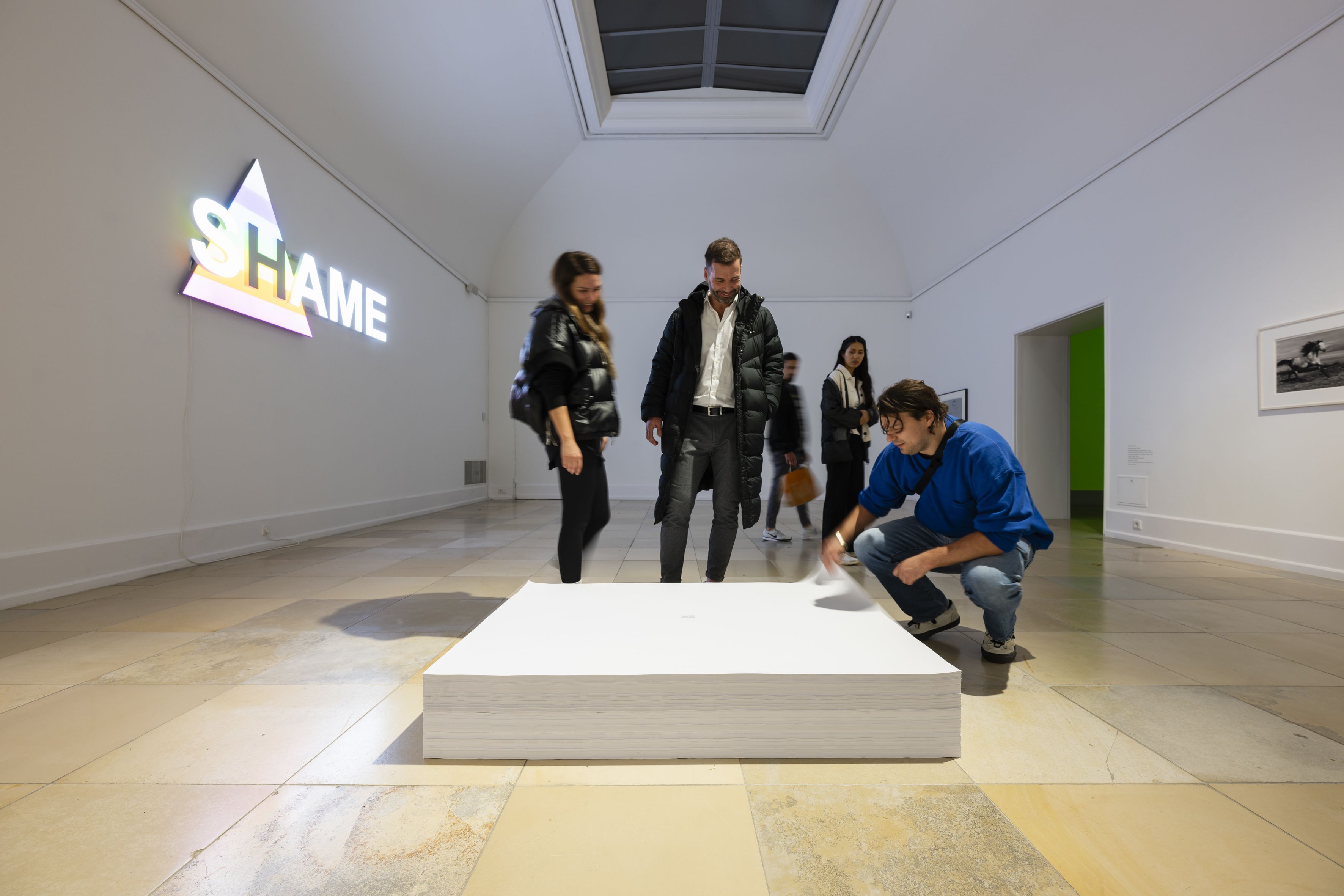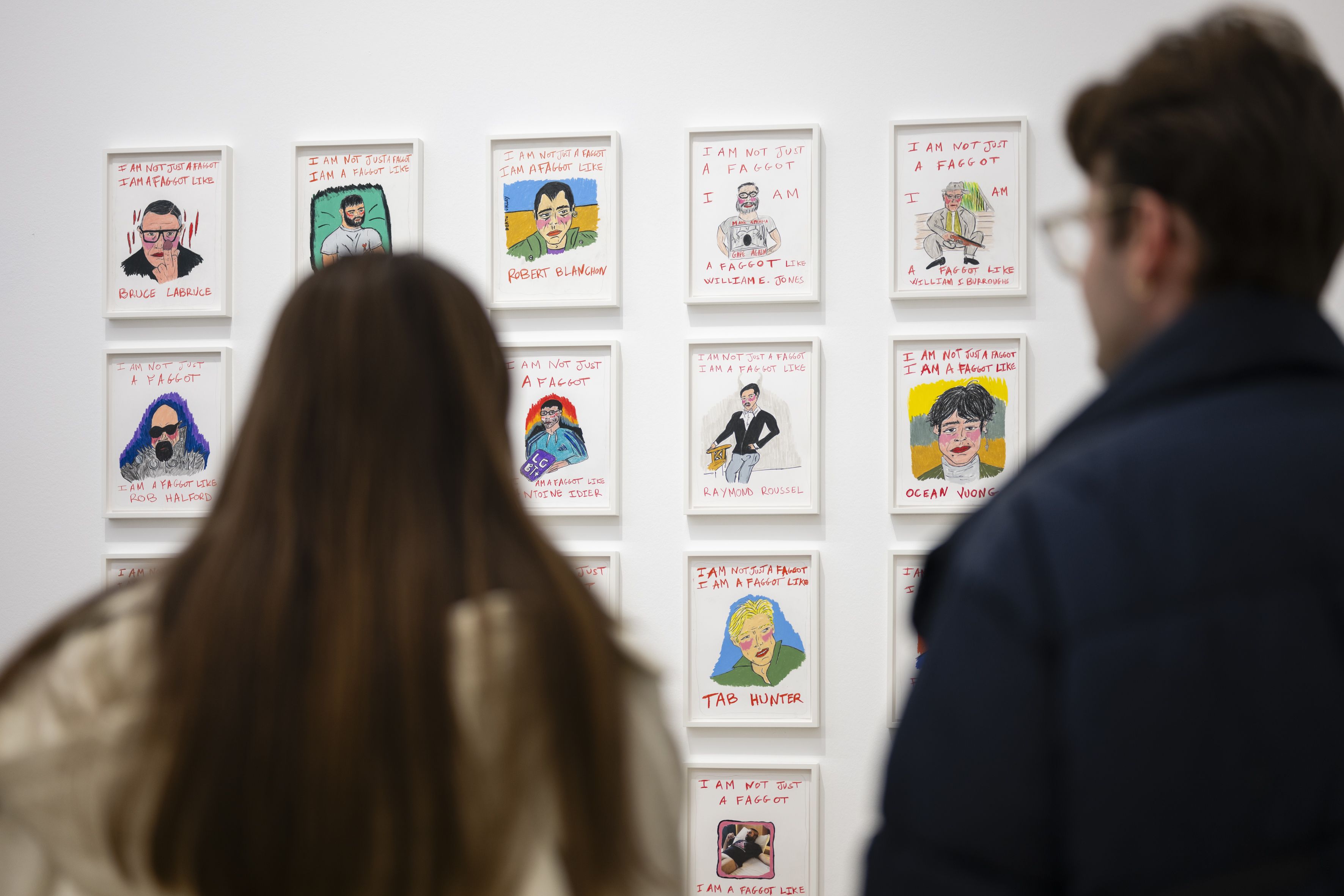 Die zivilisatorische Verheerung, die AIDS in der queeren Community angerichtet hat, kann kaum überschätzt werden. Angst, Leid, Einsamkeit und Tod waren unter den Betroffenen und deren Freund*innen und Bekannten derart allgegenwärtig, dass die diesbezüglichen queeren Kunstäußerungen der 1980er- und 1990er-Jahre sich durch nahezu das gesamte Spektrum der Kunstströmungen ziehen, von den Graffiti eines Keith Haring bis zur Minimal Art eines Felix Gonzalez-Torres. Mit welch anrührendem Flüstern der 1957 in Kuba geborene, im gleichen Jahr nach Puerto Rico gebrachte und ab 1979 in New York lebende schwule Installationskünstler uns Metaphern des Verlusts zu vermitteln scheint, das gehört zweifellos zu den eindringlichsten Relikten der AIDS-Katastrophe. Der in der Ausstellung gezeigte Paper Stack "Untitled" (Spaghetti) von 1990 verkörpert dieses Prinzip auf die denkbar reduzierteste Weise: Die Besucher*innen können Blätter des auf den ersten Blick unspektakulären Papierstapels mitnehmen, wodurch sich sein Volumen langsam plastisch verkleinert, in der Welt zerstreut und in letzter Konsequenz gänzlich auflöst. Durch die Ausstellungsorganisator*innen werden die Stapel zwar kontinuierlich aufgefüllt, zerfasern aber immer wieder und vergehen so buchstäblich vor den Beobachter*innen. Die interaktive Arbeit wird dadurch auch zu einer performativen, gemeinschaftlichen Konservierung jener grausamen Erfahrungen, die besonders die queeren Menschen einer ganzen Generation erlitten. Niemand wusste das besser als Felix Gonzalez-Torres selbst, der erst seinen Lebensgefährten Ross an die Seuche verlor und 1996 selbst an ihr starb.