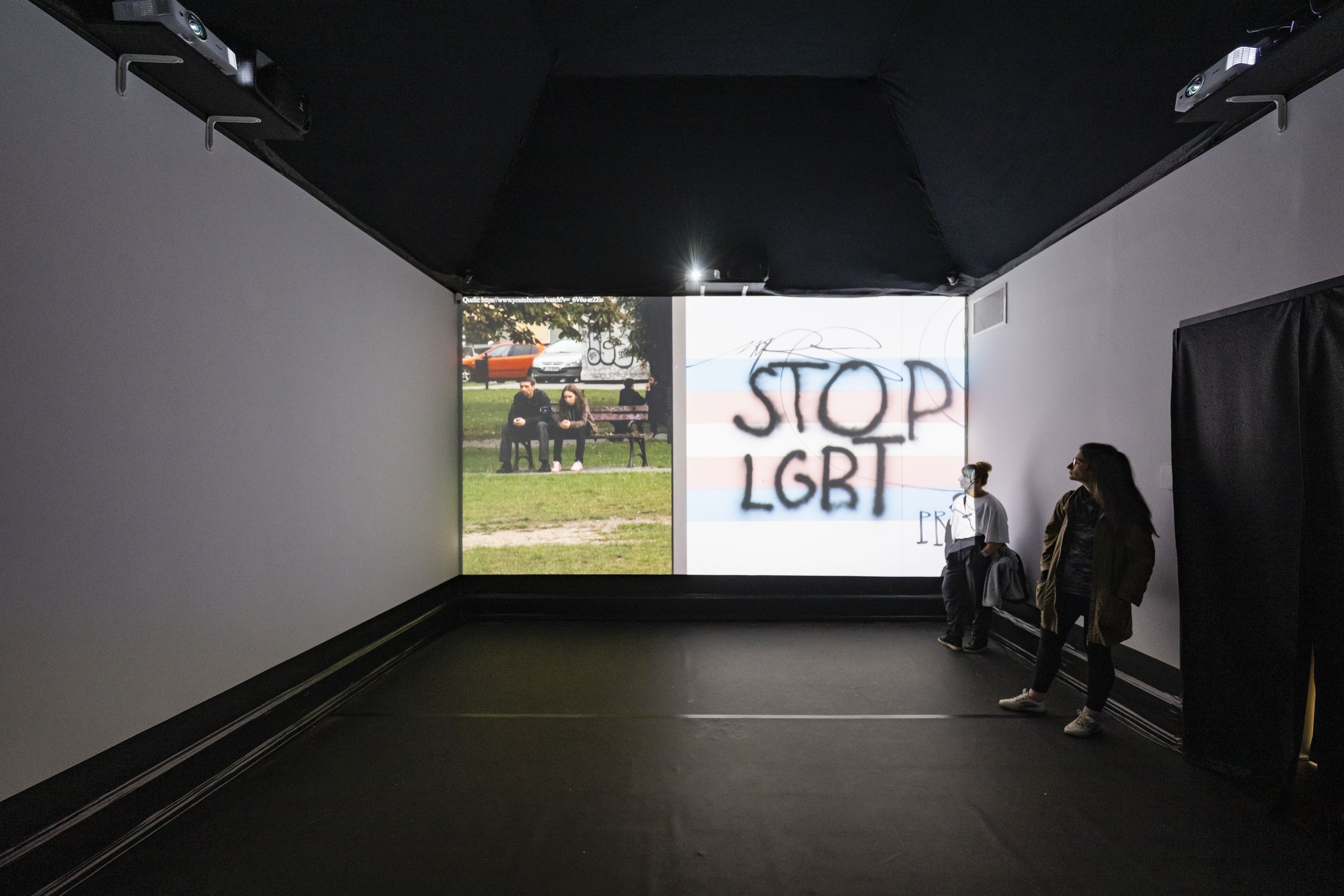 Uneindeutigkeit als Potenzial. Der Moment der Verunsicherung ermöglicht das Aufbrechen von eingefahrenen Verhaltensmustern und Wahrnehmungsstrukturen. Auf Martin Pfeifles Objekten liegen Bücher und Magazine zu queeren Themen, auf Tablets können Filme und Dokumentationen angeschaut werden. Sobald die Besucher*innen den Raum betreten, in ihm verweilen und mit den Objekten interagieren, werden sie selbst zu Akteur*innen und damit Teil der Arbeit.