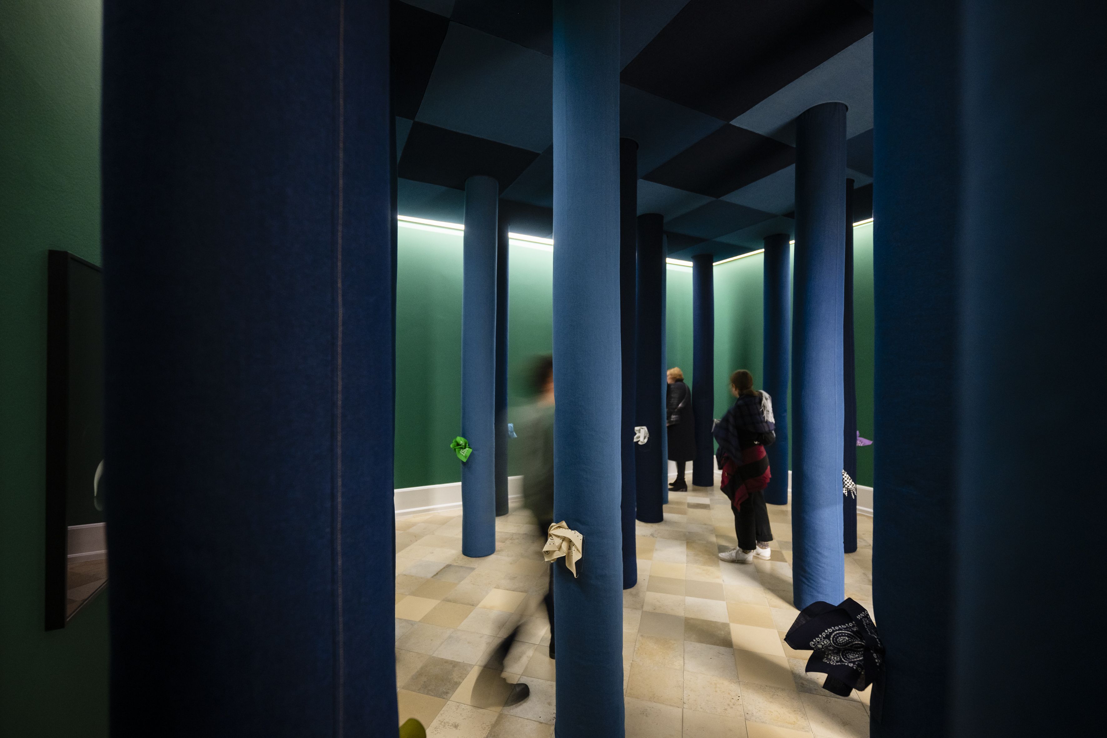 Wir tauchen in eine mysteriöse Welt ein: Aus Jeansstoff genähte Säulen strukturieren den Raum und tragen eine raumfüllende Kassettendecke von gleicher Materialität. Durch einen umlaufenden Spalt fällt diffuses Licht und erzeugt eine Atmosphäre, die an die transitorische Tageszeit der Dämmerung erinnert. Auf jede der Säulen ist eine Hosentasche genäht, in die ein farbiges Tuch gesteckt wurde. Dies führt zu einer Individualisierung und Personalisierung der Säulen, die auch durch ihr weiches Füllmaterial einen organischen Charakter gewinnen. Die Wände des Raums sind in einem satten Grün gestrichen und zeigen drei Fotografien aus der Serie Stagebeauty: Ein Fuchs, eine Eule und ein Schwan – alle aus Porzellan – sind in rätselhaften, erotisch codierten Situationen zu sehen. Mit Ohne Titel (h.c., Version B) schafft Andreas Oehlert einen Raum, der vielfältige Assoziationen weckt: vom verwunschenen Märchenwald bis zu einer „Cruising Area“, in der Menschen nach Partner*innen für sexuelle Begegnungen suchen. Die physische Präsenz der Besucher*innen wird zu einem essenziellen Bestandteil der Installation, da der atmosphärische Säulenwald auch sie durch den Raum „cruisen“ lässt.