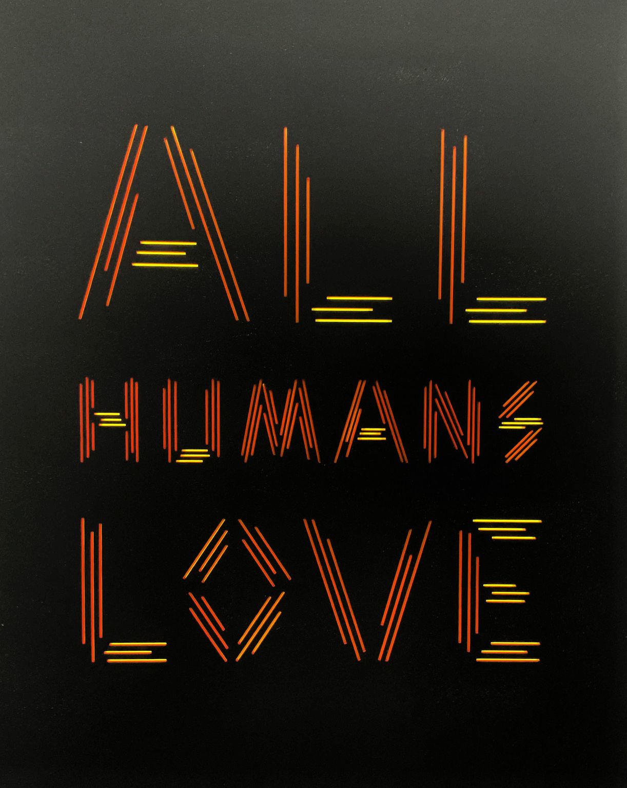 Als Bildhauerin arbeitet sie aber nicht nur akustisch, sondern auch ortsbezogen als Installationskünstlerin und setzt mit ihren Schriftzügen einen goldenen Start in die Ausstellung. Mit ihrer Kombination aus Klang, Text und Bild knüpft Julia Bünnagel im Foyer der Kunsthalle ein vielbezügliches Assoziationsnetz, das alle einlädt, ALL HUMANS LOVE in Form eines Stickers persönlich weiterzutragen.