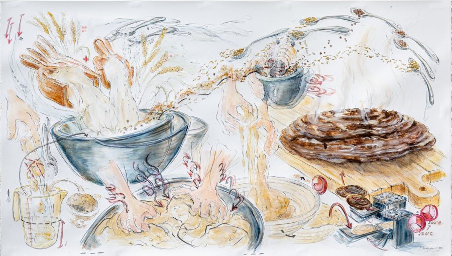 Die Zubereitung von Speisen, unser Umgang mit Lebensmitteln und wie sie sich in unserem Körper bewegen, das sind Themen, mit denen sich Sonja Alhäuser in unserer Ausstellung beschäftigt. Rezepte in Form von Bildern zeigen ihre großformatigen Aquarelle ebenso wie den Durchlauf von Speisen durch unseren Körper vom Körpereingang bis zum -ausgang. Ihre überlebensgroße Margarineskulpturen erinnern an opulente barocke Festbankette.