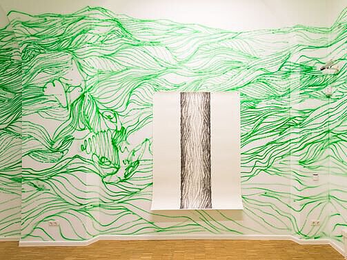 Christian Schwarzwald sprüht seine Zeichnungen direkt auf die Wände des 30 Meter langen Gangs des Kunsthauses. Diese freien, an Vegetation erinnernden Wandzeichnungen werden von großformatigen Kohlezeichnungen überlagert, die detailliert die Oberflächenbeschaffenheit eines Baumstamms wiedergeben. Es entsteht die Vorstellung einer Allee, durch die der Betrachter flaniert. Auch Christine Rusche entwickelt ihre Raumzeichnungen stets für den konkreten Ausstellungsort. Direkt auf die Wand gezeichnet, reflektiert die Bildebene die Beschaffenheit der jeweils spezifischen Architektur und ein Dialog zwischen realer und fiktiver Raumstruktur entsteht. Anja Buchheister verbindet Cut-Out-Objekte und -Installationen mit gerahmten Zeichnungen zu einer raumgreifenden Inszenierung, die zwischen Zwei- und Dreidimensionalität changiert und mit der Wahrnehmung des Betrachters spielt. Mit Tuschestiften zeichnet Heidi Sill auf die Wand des Ausstellungsraums. Die verschlungene Lineatur, die medizinisches Archivmaterial abstrahiert, verbindet sie mit zarten Gliederketten und Strängen aus Echthaar zu einer assoziationsreichen wie diffus beunruhigenden Rauminstallation. Motoko Dobashi verbindet in ihrer Wandarbeit zeichnerische Elemente mit einer speziell für die Installation geschaffenen Papiertapete die das Motiv eines Origami zeigt. Dabei bilden die gezeichneten, amorphen Wolkenformationen und die geometrischen Faltungen einen spannungsreichen Kontrast.