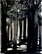 Mit Tusche, teils farbig lasiert, lässt uns Jochen Streichert mittels einer umfangreichen wie hochinteressanten Serie, zwischen Bäumen durchschauen.