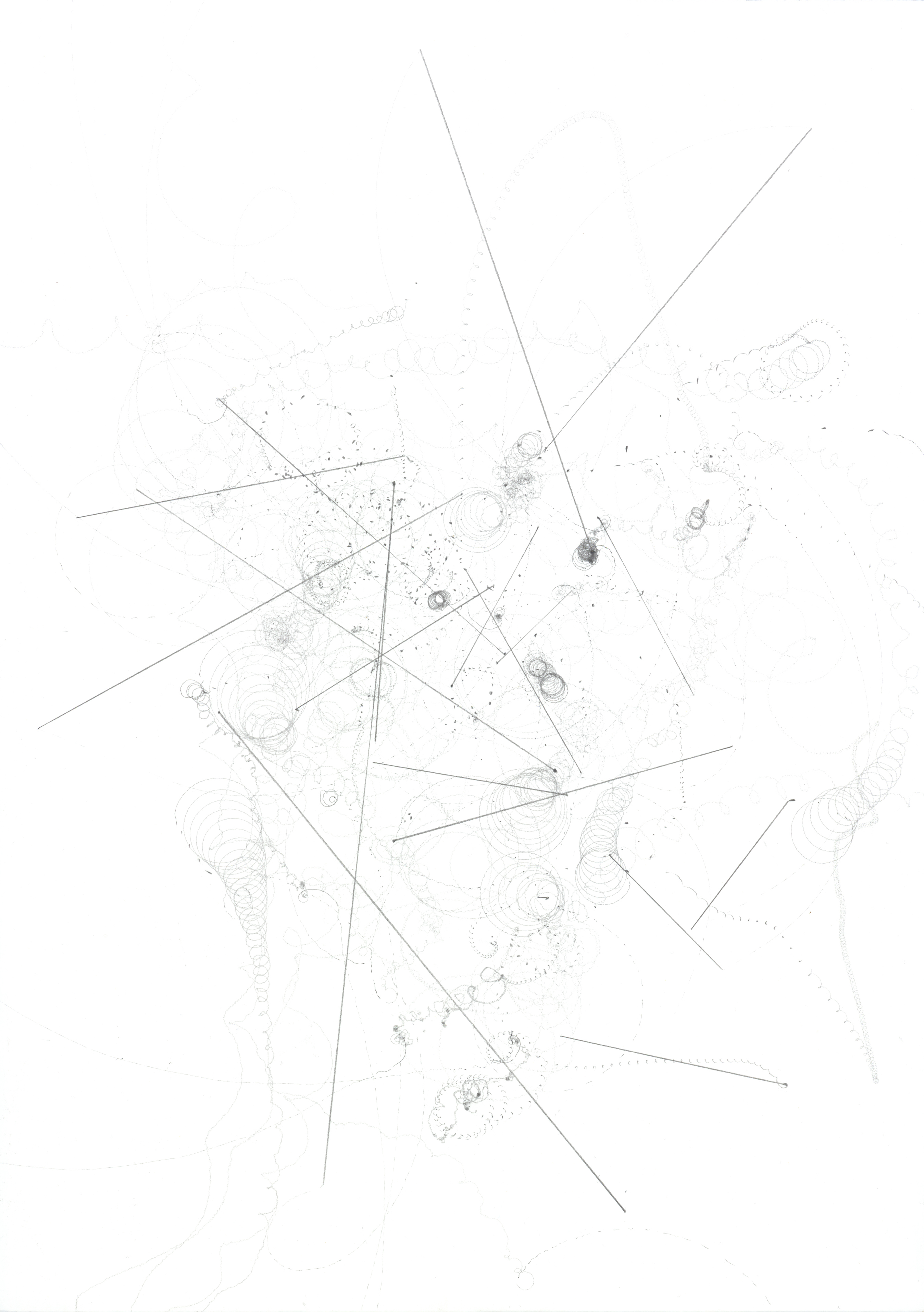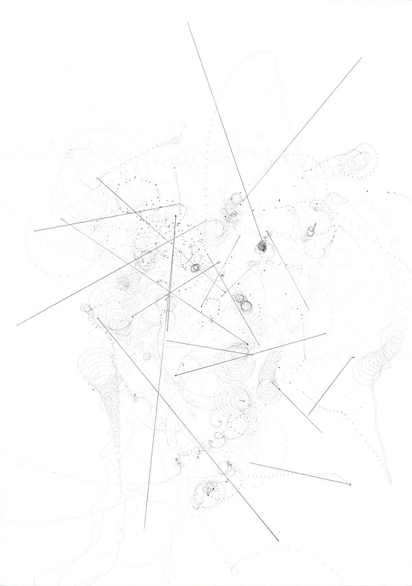 Matthias Ströckel zeichnet in seiner offenen Werkserie Weg/Zeit (seit 2010) über einen langen Zeitraum eine horizontale Linie mit schwarzer Tusche und Feder auf Papier, die an die Linie eines Seismographen erinnert. Der Titel nennt mit Datum und Uhrzeit den Beginn und die Fertigstellung einer Arbeit. In seinen Studien (2012) nutzt er einen Zeichenkreisel, wiederholt auf dem Zeichengrund losgelassen, zieht er unkalkulierbar seine Bahnen und hinterlässt spiralförmige Linien auf Papier. Den Anfangs-und Endpunkt verbindet er mit einer Vektorlinie und schafft somit Arbeiten im Spannungsfeld von Zufall und Konstruktion.