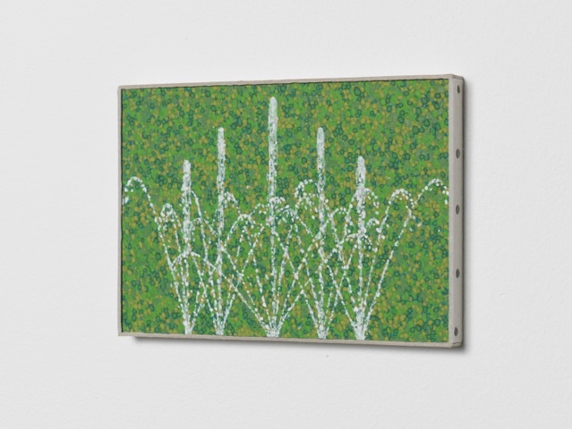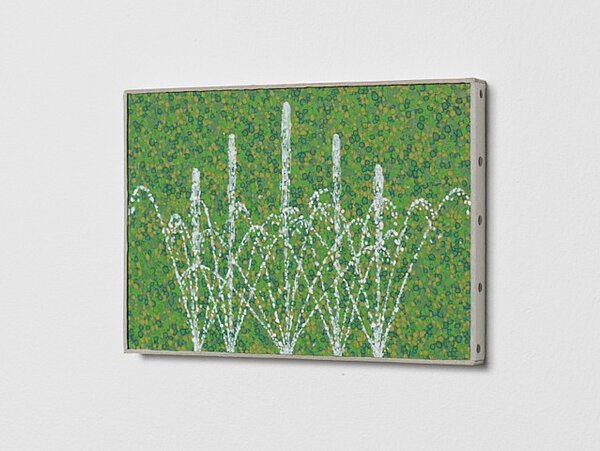 Alexander von Falkenhausen „beschränkt“ sich in den Serien Aufzeichnungen und Parkstücke (offene Werkserie) auf ein einziges Motiv – die Fontäne. Diese steht für eine kontinuierliche Veränderung ihrer Form und damit eigentlich im klaren Gegensatz zur visuellen Aufgeräumtheit seiner Bildwerke. Die annähernd postkartengroßen Gouachen zeigen in der Bewegung variierende Fontänen, angeordnet auf naturalistisch anmutendem, abstrakt-ornamenthaftem grünen Grund.