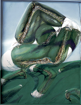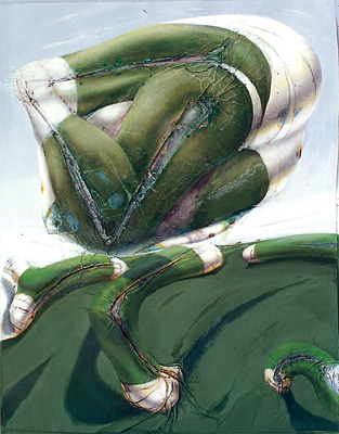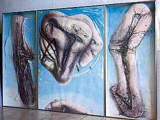 So finden sich aus der frühen Phase im großen Umfang die "Body-Bilder", auf denen Körperteile dominieren ineinander verschlungene Beine in Grün oder Blau, auch Arme oder Brüste. Der Körper als Ersatzteillager, künstlerisch neu erschaffen. Es folgen die berühmten "Krankheitsbilder" mit verstümmelten Menschen, verwundet, eitrig, vielfach amöbenartig. Metaphern für "lebensgefährliche Wilbelsäulenverletzung" (Dollhopf) sind die "Rücken"- und "Fenster-Bilder". Die eindrucksvollen Papierarbeiten seiner "Hackstücke und Faltungen" bilden einen weiteren Schwerpunkt, empfindliche Papierobjekte, entstanden aus schwerem Büttenpapier, bis zur Auflösung geschlagen, gedehnt, gerissen, gedrückt, gefaltet und gerieben und zu plastischen Gebilden von unglaublich intensiver Ausstrahlung geformt, teilweise in Kästen als Tryptichen montiert oder dreidimensional, frei hängend an Fäden.