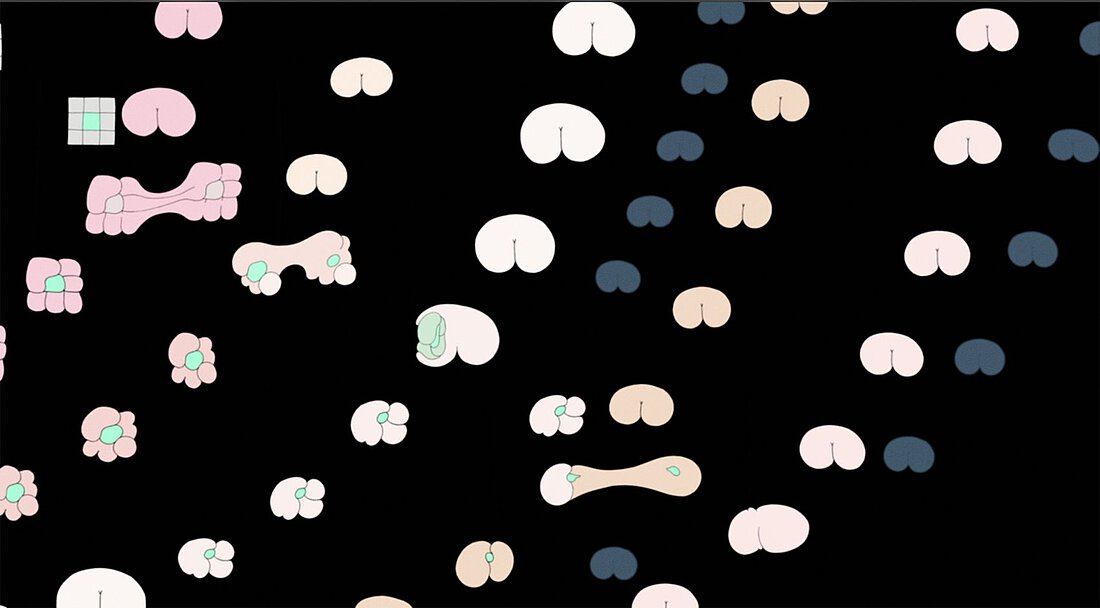 Beinahe lieblich erscheinen Oliver Husains Aquarelle Untitled (Croqs) und seine bunten Figurenspiele. Mit meditativ langsam wechselnden und von getragenen Klängen begleiteten Formkonstellationen erzeugt er im ersten Teil seines Films Foily Footlights (2022) eine Traumreise-Stimmung, die fließend entlang der Grenze zum Sentimentalen balanciert.