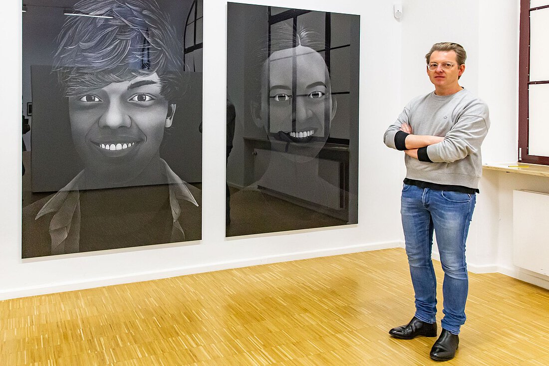 Thilo Westermann nutzt für seine Porträts der Jugendlichen eine spezielle Form der Hinterglasradierung, indem er die Gesichter zunächst Punkt für Punkt aus geschwärzten Glasplatten radierte. Das fertige Bild wurde gescannt, um ein Vielfaches vergrößert und als großformatiger Abzug hinter Glas ausgestellt.