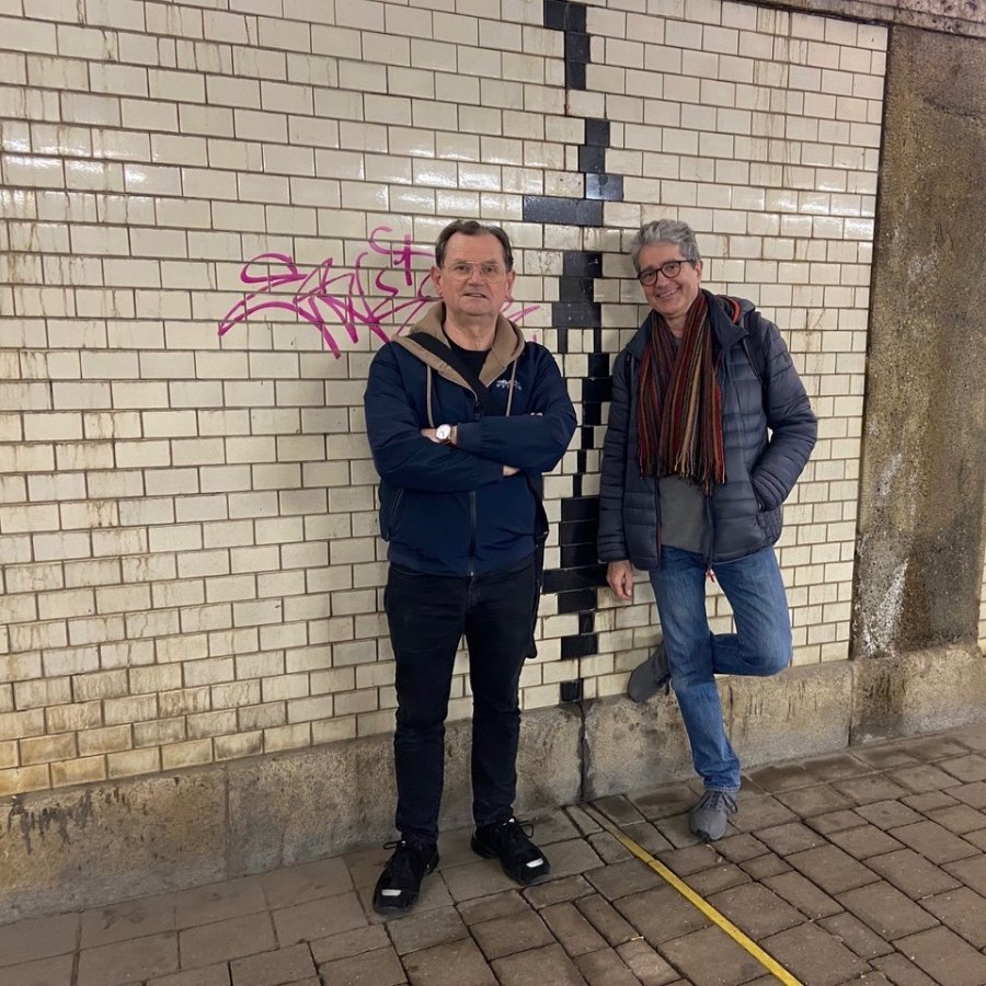 Winfried Baumann hat ein Klang-Kunstprojekt für diesen Tunnel entwickelt. Durch das Ersetzen der schadhaften Wandfliesen mit schwarzen Granitfliesen entstand ein Wandbild, das einer abstrakten Notation gleicht.