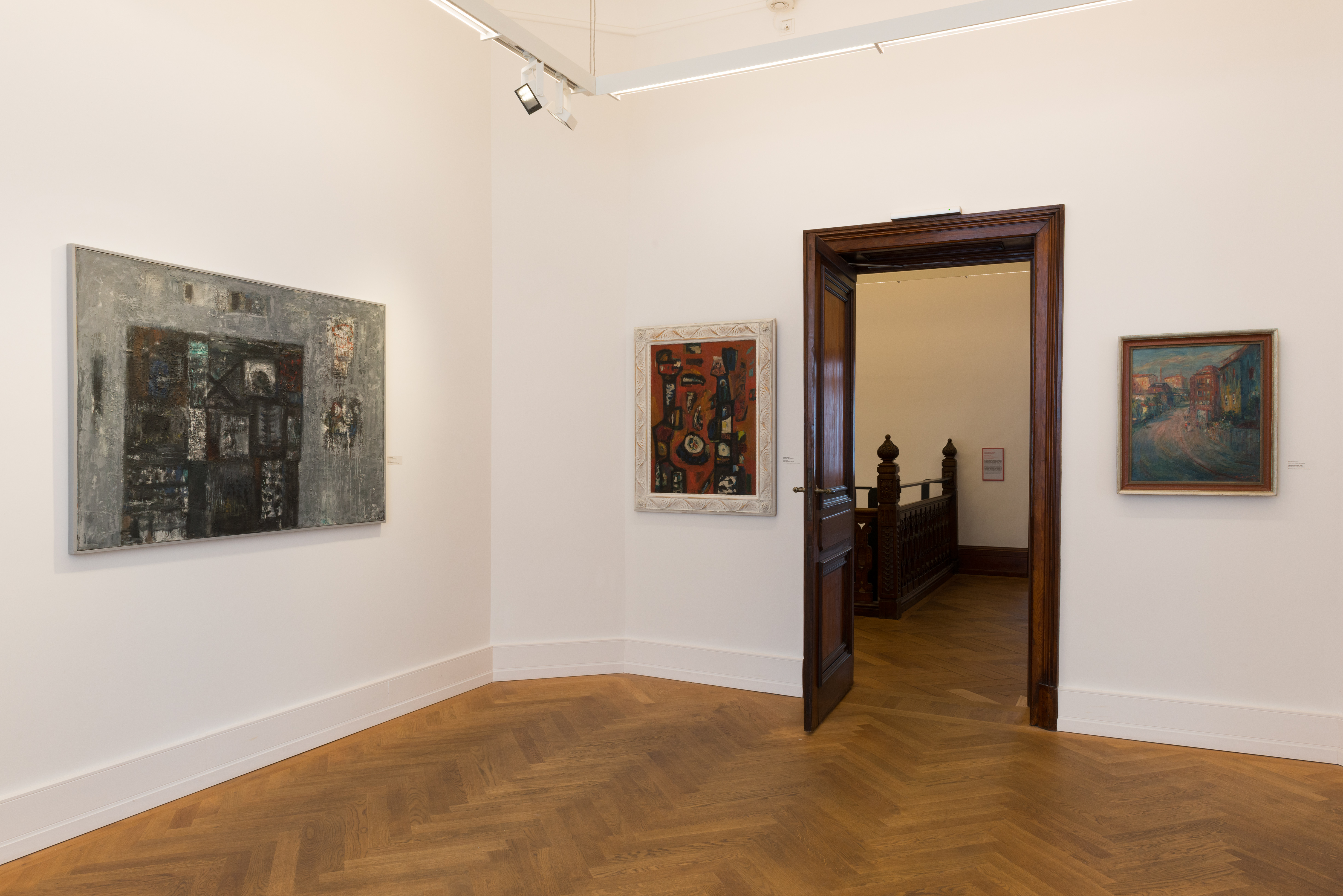 Im Jahr 2019 richtete die Kunstvilla innerhalb ihrer Dauerausstellung einen Jubiläumsraum ein, in welchem Künstlerinnen und Künstler der Sammlung mit kleinen, retrospektiv ausgerichteten Einzelschauen vorgestellt werden. Den Beginn machte der 1919 in Ulm geborene Künstler Theodor Reichart. Nach einer Ausbildung zum Techniker und Konstrukteur besuchte Reichart ab 1949 die Volkshochschule Ulm unter der Leitung von Inge Scholl (1917 – 1998), aus der 1953 die den Bauhaus-Gedanken aufgreifende Hochschule für Gestaltung hervorging. Im Anschluss nahm Reichart 1954 ein Studium an der Akademie in Nürnberg bei Hermann Wilhelm (1897 – 1970) auf. Zu diesem Zeitpunkt war er bereits 35 Jahre alt und wurde in der Folge einer der Künstler, deren Werke die Stadt Nürnberg aus Ausstellungen bevorzugt ankaufte. In diesen Gemälden, die sich an der Formensprache der Klassischen Moderne orientieren, hielt Reichart seine unmittelbare urbane Umgebung fest. Innerhalb der Nürnberger Künstlergruppe »Der KREIS«, der er 1961 beitrat und bis zu seinem Tod 2003 angehörte, vertrat Reichart eine dezidiert gegenstandslose Position. Seine pastosen, mit unterschiedlichen Materialien und Oberflächen spielenden Gemälde rufen häufig architektonische Strukturen in Erinnerung.