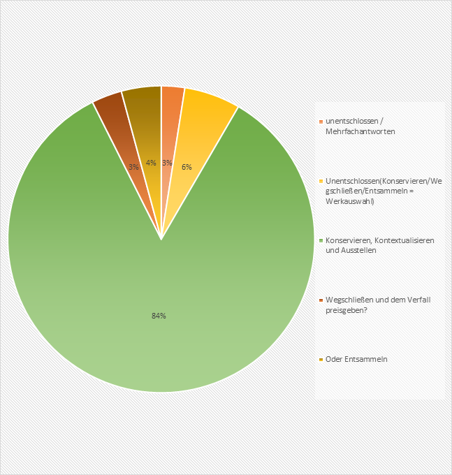 Jede*r achte Besucher*in nahm an der Umfrage teil, die nach dem Umgang mit NS-Kunst im Museum fragte. Eine überragende Mehrheit von 90 % der Teilnehmer*innen entschied sich teilweise oder ganz für „Konservieren, Kontextualisieren und Ausstellen“.