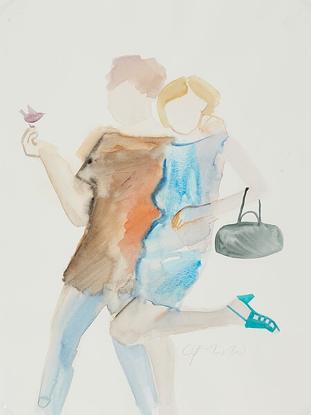 Cornelia Effner, Männer, Vogel und Katze, 2017, Aquarell auf Papier, 59,5x42 cm, Sammlung Kunstvilla, Foto: Annette Kradisch