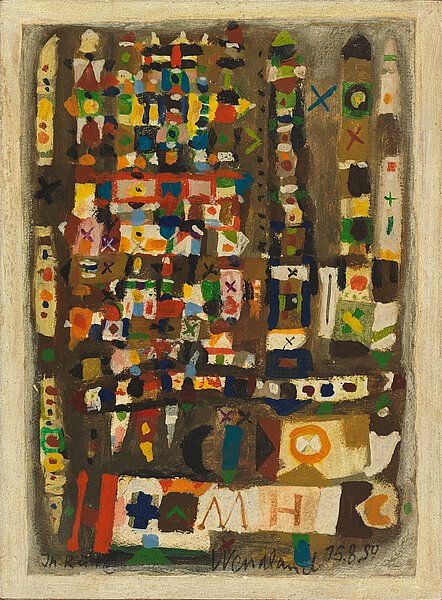 Gerhard Wendland (1910 – 1986) gehörte in den 1950er-Jahren zu den Künstlern, für die der Weg in die Abstraktion den Anschluss an die internationale Avantgarde bedeutete. Mit seinen Zeitgenossen Werner Gilles (1894 – 1961), Werner Heldt (1904 – 1954) und Eduard Bargheer (1901 – 1979) vertrat Wendland zunächst Anfang der 1950er-Jahre eine an Paul Klee (1879 – 1940) angelehnte lyrische bis surreale Figuration, bevor er mit den ab 1957 entstandenen sogenannten „Teppichbildern“, zu denen auch das Werk „M.H.HAUS“ von 1959 zählt, zu einer ihm eigenen Ausdrucksweise fand.