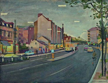Bei dem Gemälde „Straße in der Dämmerung“ handelt es sich um eine Ansicht der Bayreuther Straße mit der Straßenbahnhaltestelle Rennweg. Das um 1965 entstandene Gemälde zeigt Menschen in Bewegung; Fußgänger und Radfahrer, Autos und die Straßenbahn sind unterwegs, in der Dämmerung leuchten die elektrische Straßenbeleuchtung und helle Schaufenster.