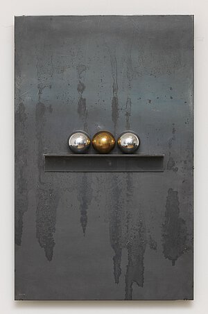In dem Werk „Carambolage“ fassen zwei silbern glänzende Aluminiumkugeln, die symbolisch für Mond und Erde stehen, eine Messingkugel ein, die die Sonne verkörpert – eine momenthafte Karambolage, die in der Bewegung erstarrt.