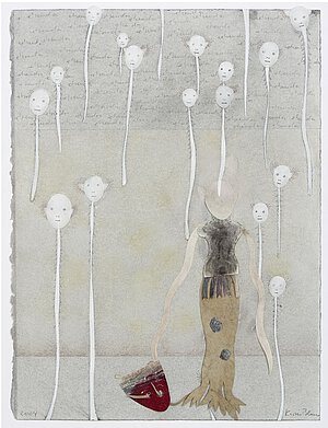 Das 2004 datierte Werk „Ohne Titel“ zeigt, wie Blums Collagen zwischen Gegenständlichkeit und Abstraktion changieren. Die zeichnerischen Figurationen, wie die schwebenden Köpfe, erinnern dabei an surreale Traumwelten.